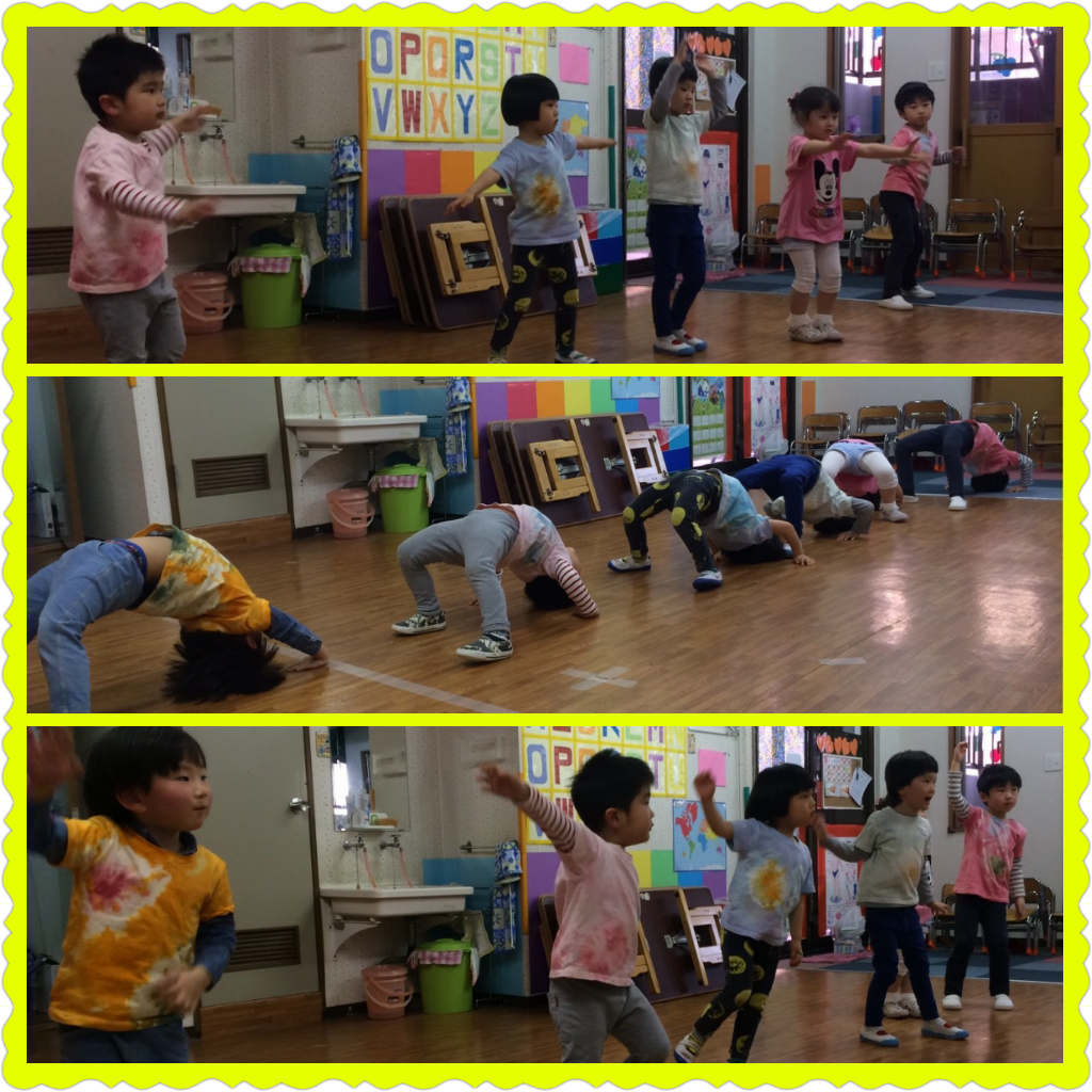 動物の鳴き声や動きの真似っこをした、年少さん。