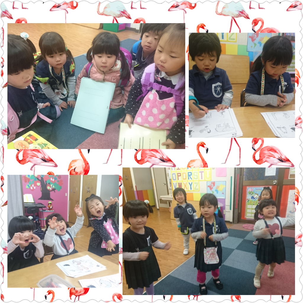 まずは、絵の中の平仮名探し、そしてドリル、最後は画用紙に文字を書きます。文字を書くときは、筆や鉛筆を使うのではなく指に絵の具を付けて書きます!そうすることで、筆圧が均等に上手に書けるのです!…確かに、鉛筆で書くよりずっと上手にかけた3人。