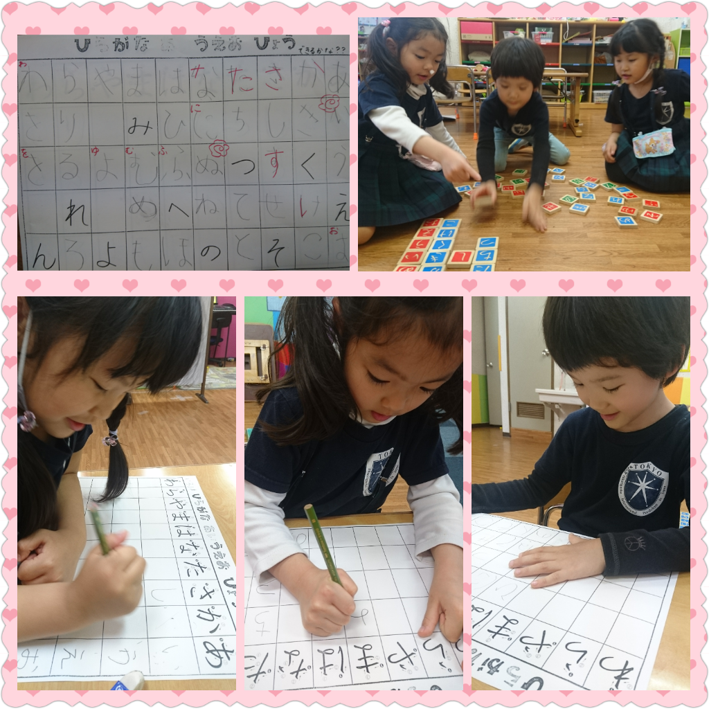 年長さんは、やっと3人揃ったので平仮名50音の復習を♪