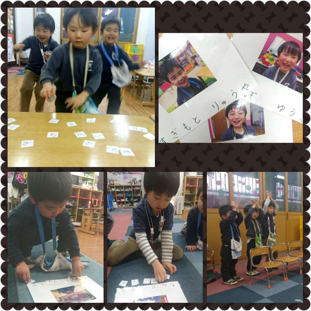 走るのが大好きな3人は名前に使われている平仮名の札をとるために、走り回ってたくさん汗をかいてお勉強しました。
