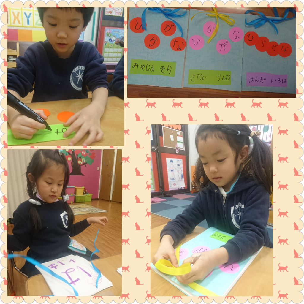 4月から頑張って書きためた平仮名の画用紙を製本しました!「あ~ん」まで五十音よく頑張りました!