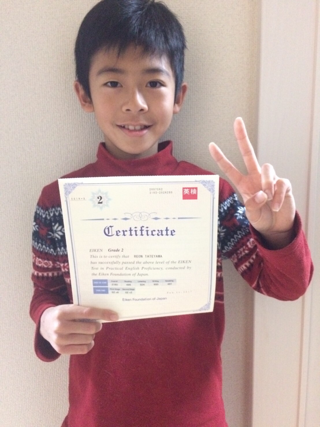 Leon Tateyama Elementary 4th grader, passed Eiken 2nd