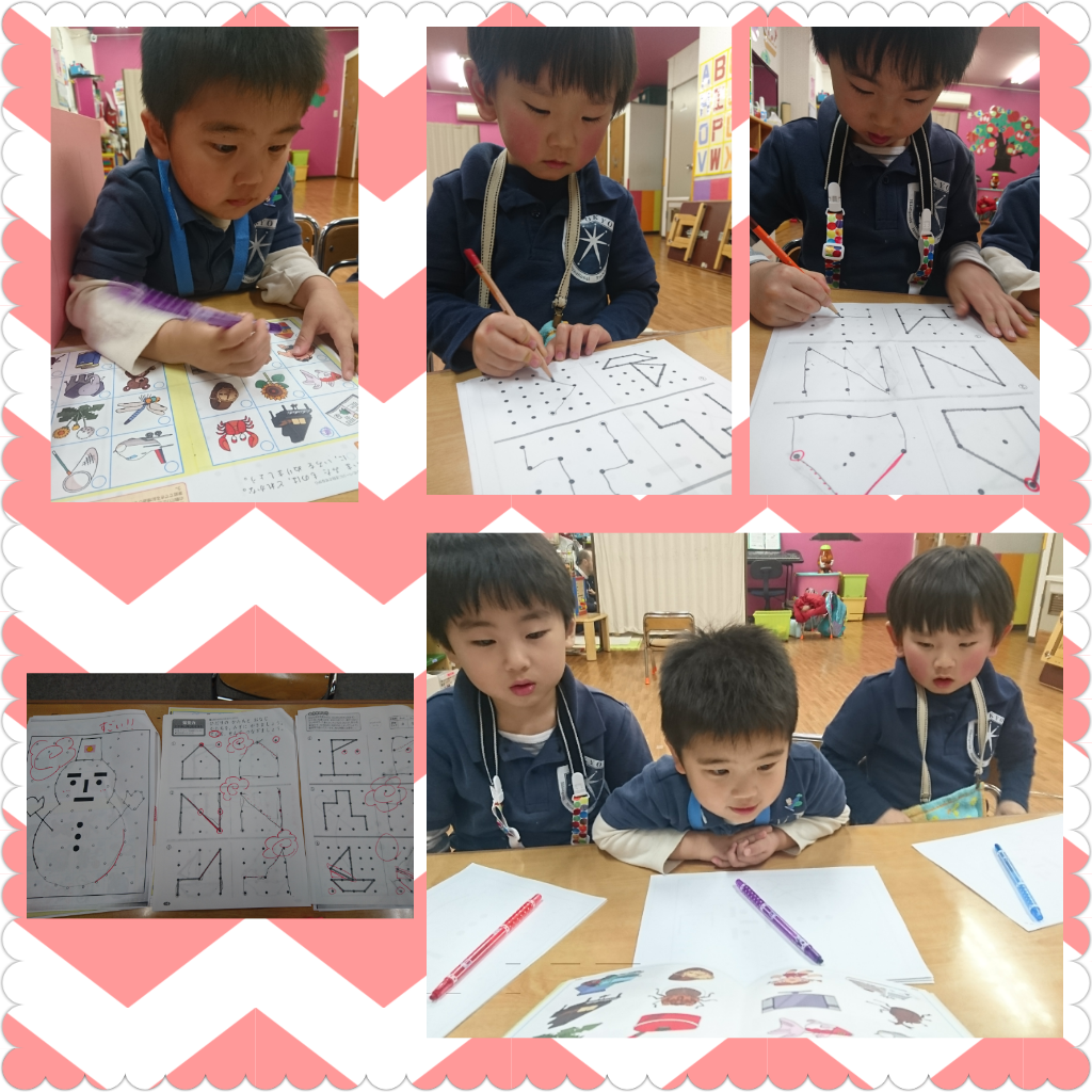 年少さんは、暗記のプリントと点つなぎをしました。