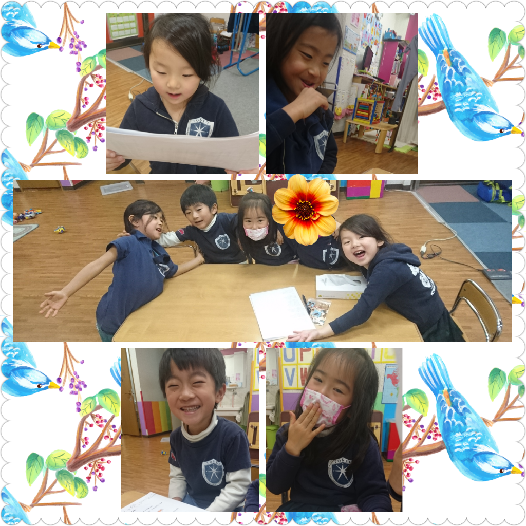 平仮名で文章作りなどをできるようになった年長さんは、今度は文章を読む練習もかねて小さな劇をすることにしました。役になりきって台詞を言ったり、ナレーションをしたり…。どんな劇になるか、楽しみです♪
