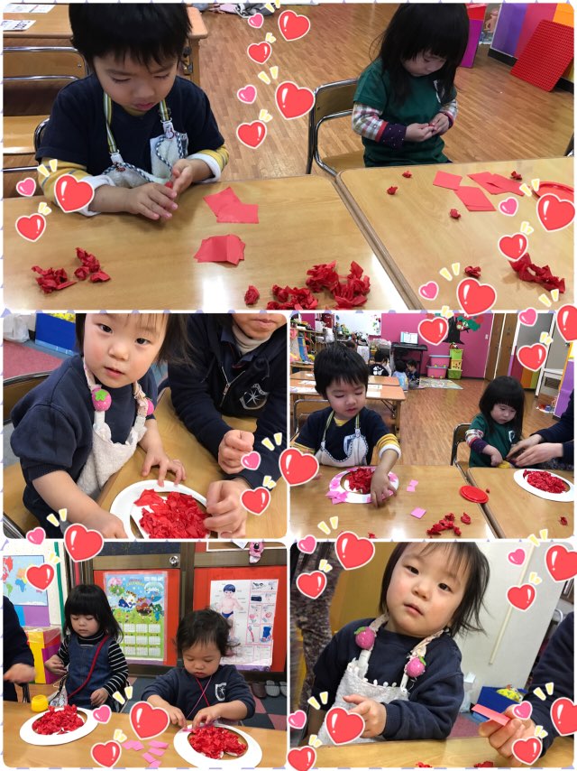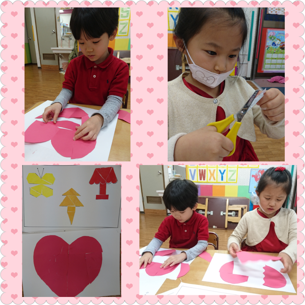 今日はバレンタインデーなので、最後はハートの図形を5枚に切り分けた後、お友だちとパーツを交換したのちハートを構成しました!!