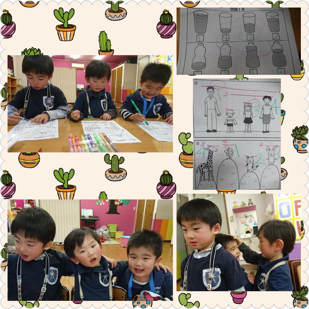 背比べをして低い順や高い順に並んだ後にプリントをしたり、飲み物の量を多い方から順に番号をふったり…。いっぱい、たくさん、少し、ちょっとの言葉の勉強もしました。
