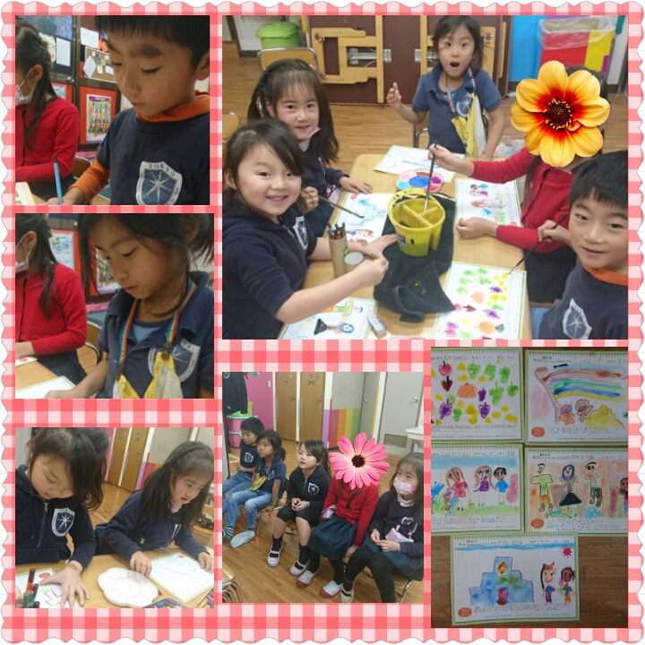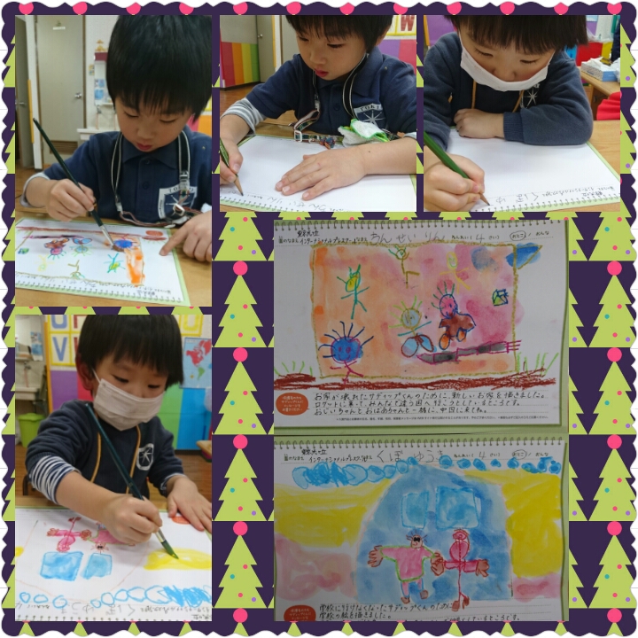 ちびっこお絵描きコンテストに出す絵を描いた年長さん。ネパールにいるサディップくんのお話と何を描いたら喜ぶか、目的意識をはっきりさせて絵と文章を描きあげました。