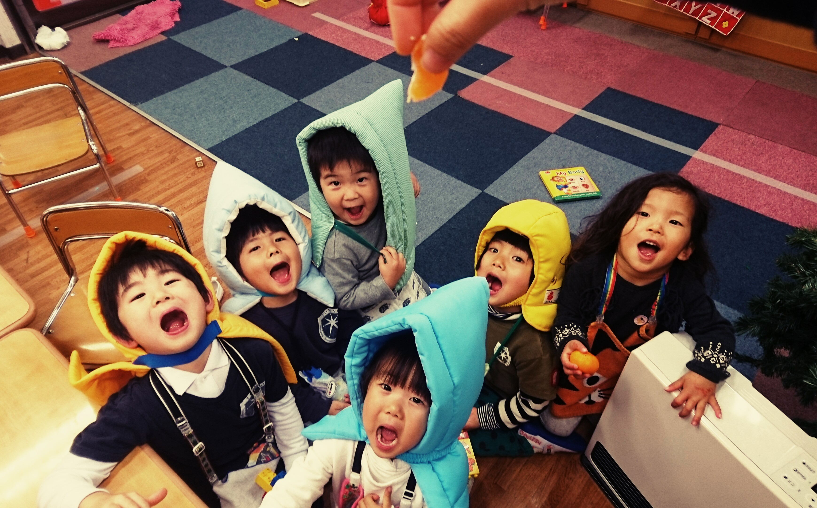 風邪や嘔吐、下痢…そして胃腸炎が流行っているので、みかんpartyをしました‼まるで、雛鳥のような子どもたち…可愛い