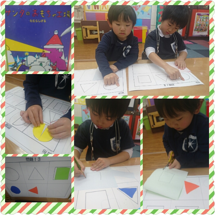 プリントに描かれた形と大きさを見て、同じ形同じ大きさになるよう鉛筆とハサミを駆使して図形を作りました。なかなかプリントと同じ大きさにならず「あれ、小さい!!曲がってる」など呟きながら取り組みました。