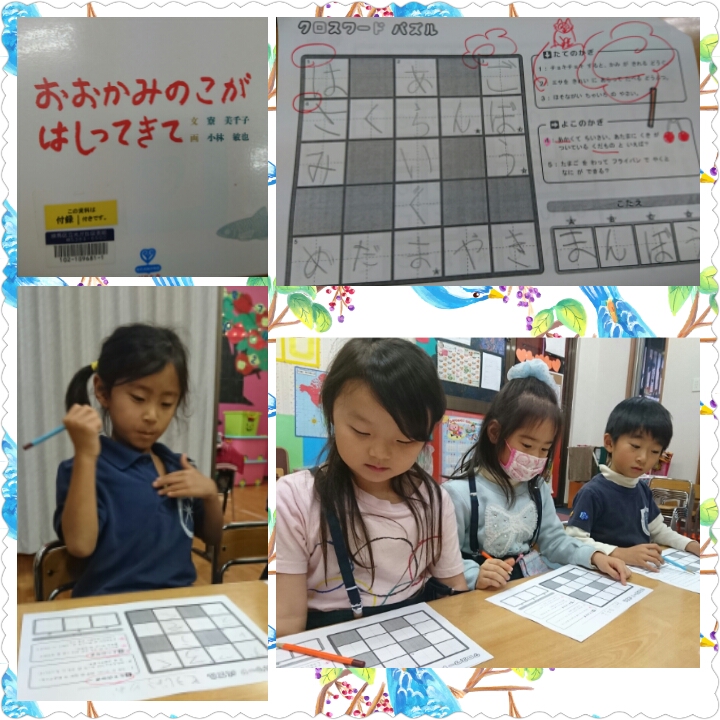 今日は、クロスワードに挑戦しました。質問の文章を読み、意味を理解して答えを書く…さすが、年長さん‼良くできました~