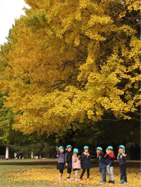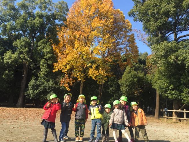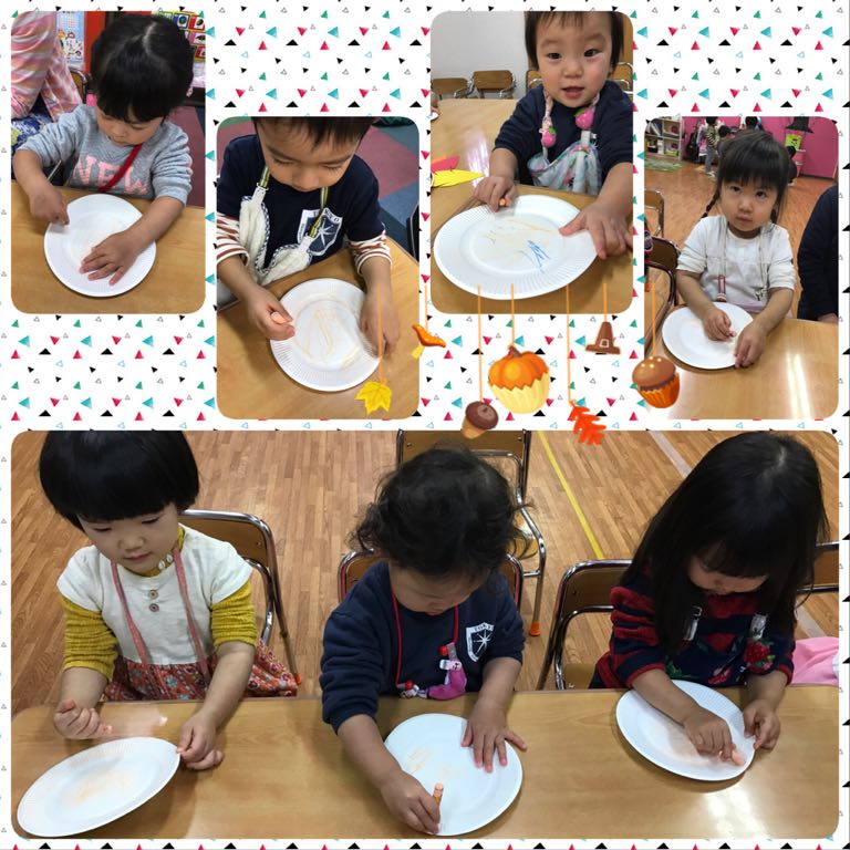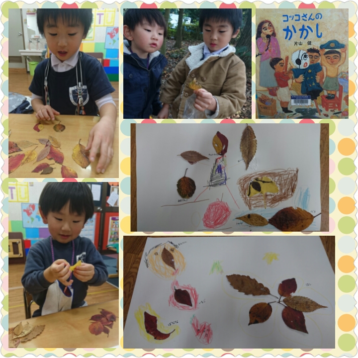 先週拾ってきた秋の綺麗な色の落ち葉を押し花のように平らにして、落ち葉アートを楽しみました。細長い葉っぱを頭に付けたらウサギみたいだね!?他には何かあるかな?…長いお父さんの鼻みたい、ウルトラマンの顔みたいだから体を描こう‼子どもたちの発想の豊かさを知ることが出来ました。