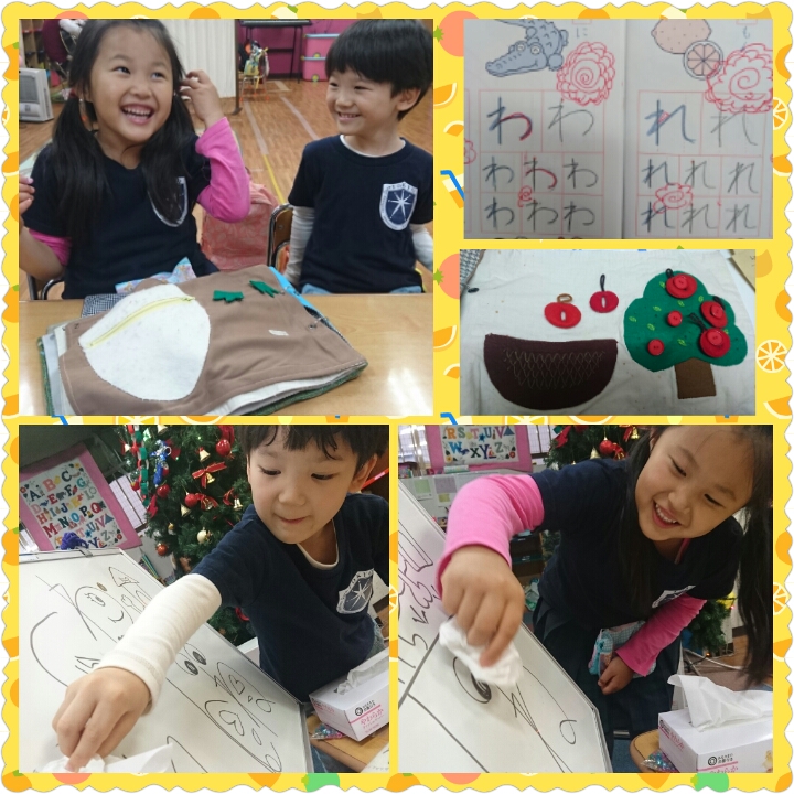 平仮名を上手に書いたあと、余った絵の具を使って好きな言葉を書いたり、布絵本を使ってお話作りを楽しみました。