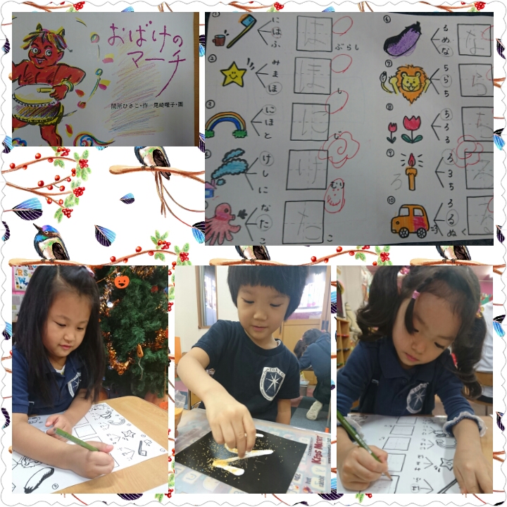 年中さんは、平仮名の復習。難しい【ろ】は何度も書き直してもらいました。