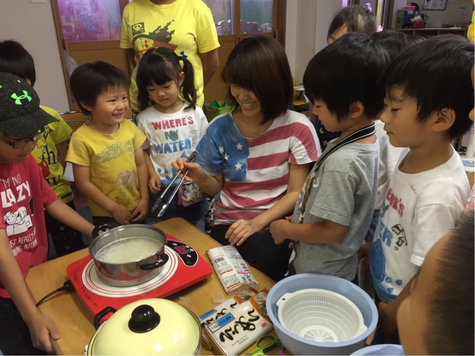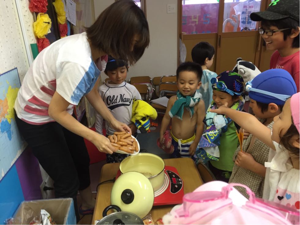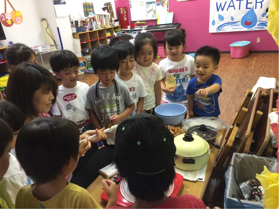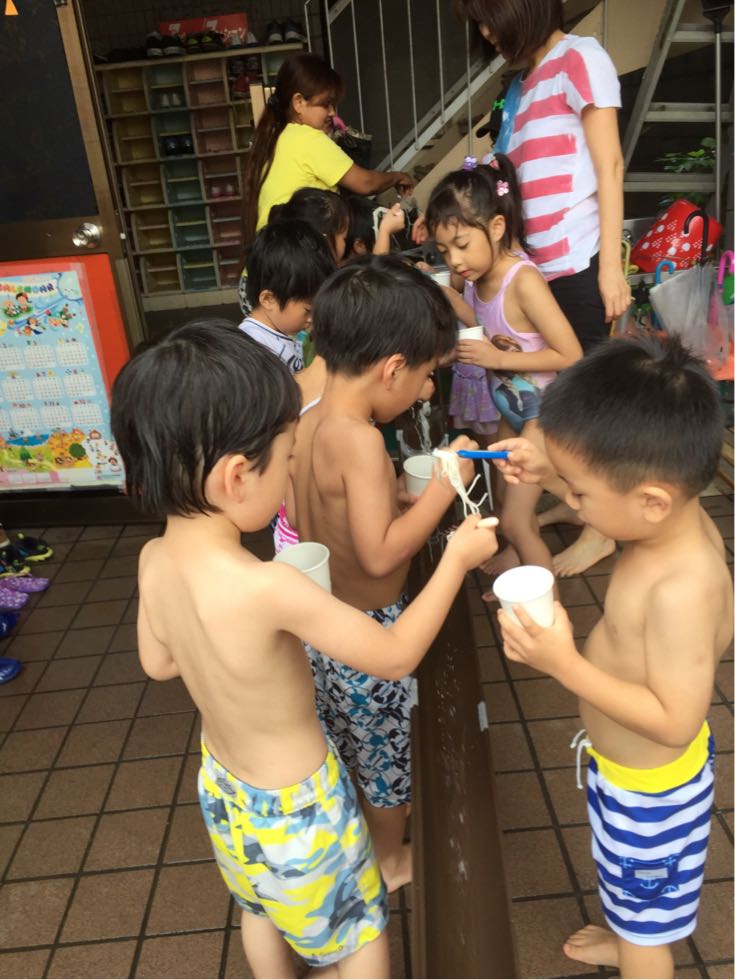The children realized that their moms can't cook without water. Today we cook boiled sausages and somen noodles.