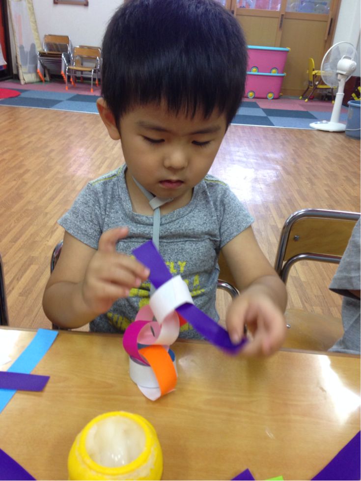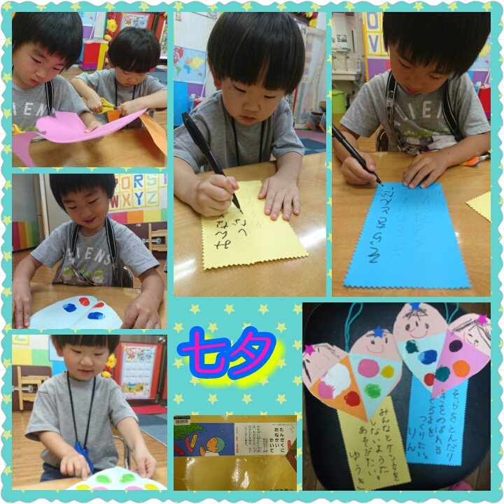年少さんは、織姫と彦星が会えたところをデカルコマニーで表現してみました。文字を書くときにに「りんごの り~。からすの か~。」言いながら、字を書く喜びを味わってくれていました。
