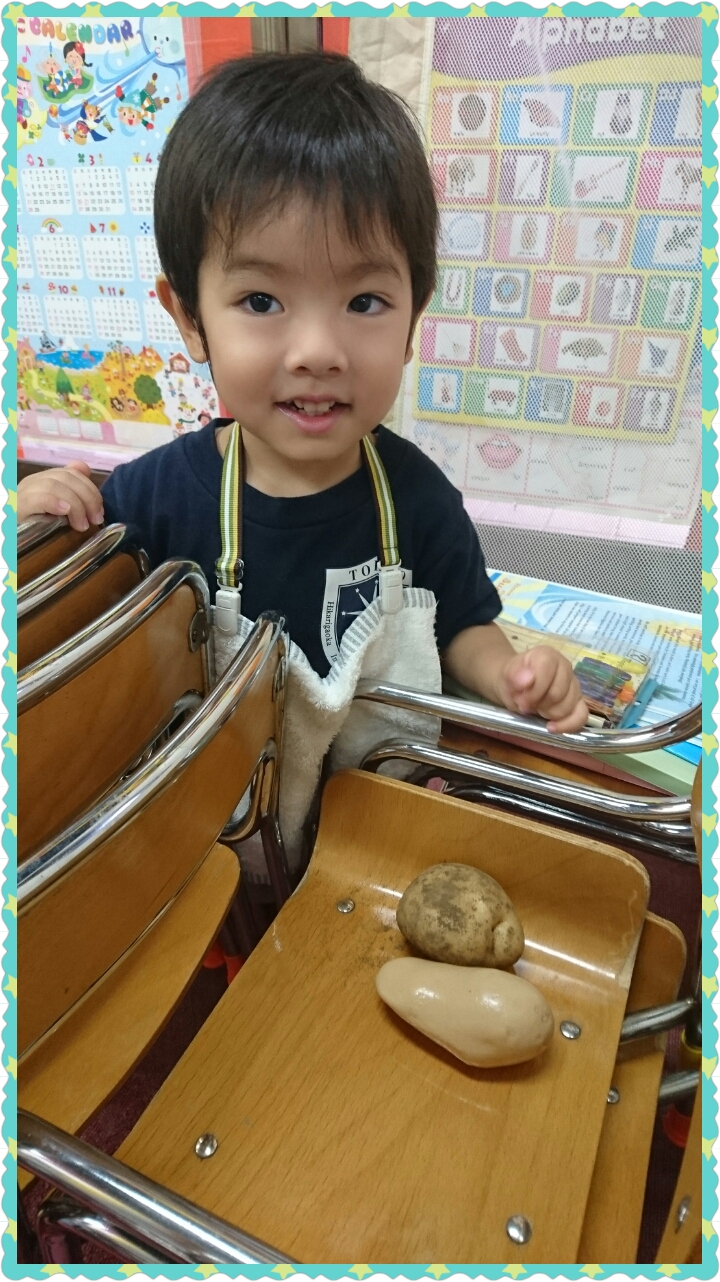 お部屋に本物のじゃがいもが落ちている…という不思議な月曜日。おもちゃのPotatoを横に並べて、「Potato」と大笑いしていたHくん。