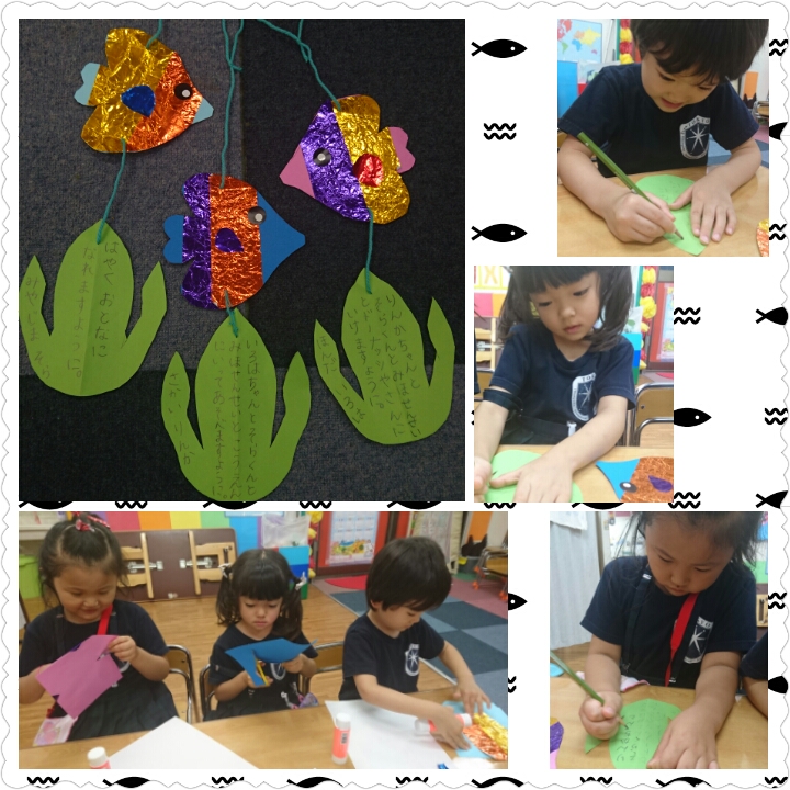 年中さんは、暑い毎日を忘れさせてくれそうな、キラキラ輝く魚と海藻の短冊。