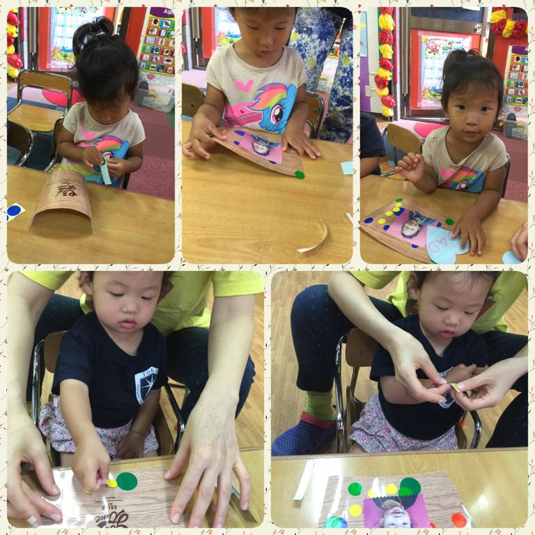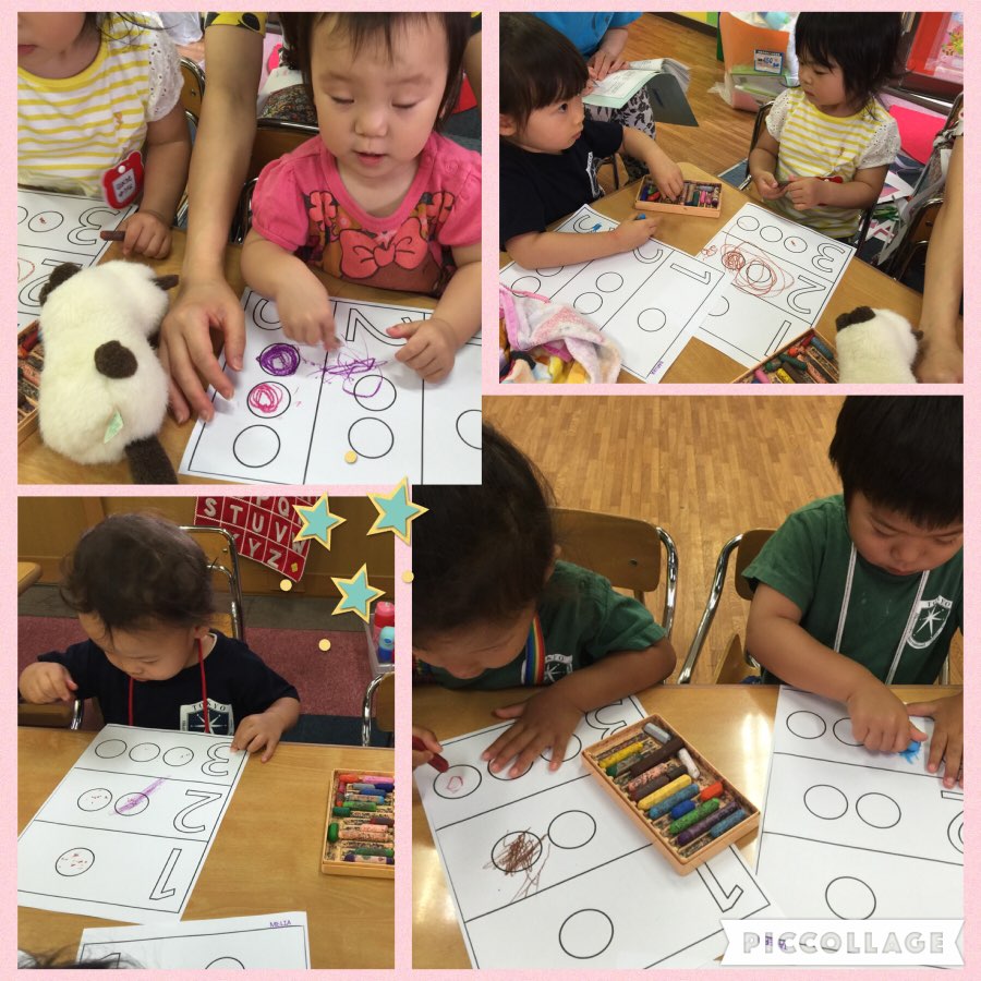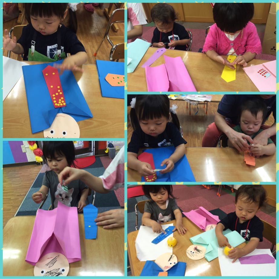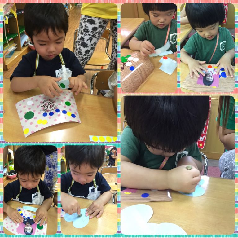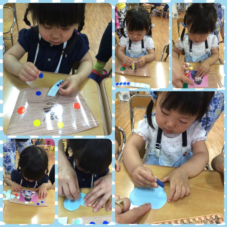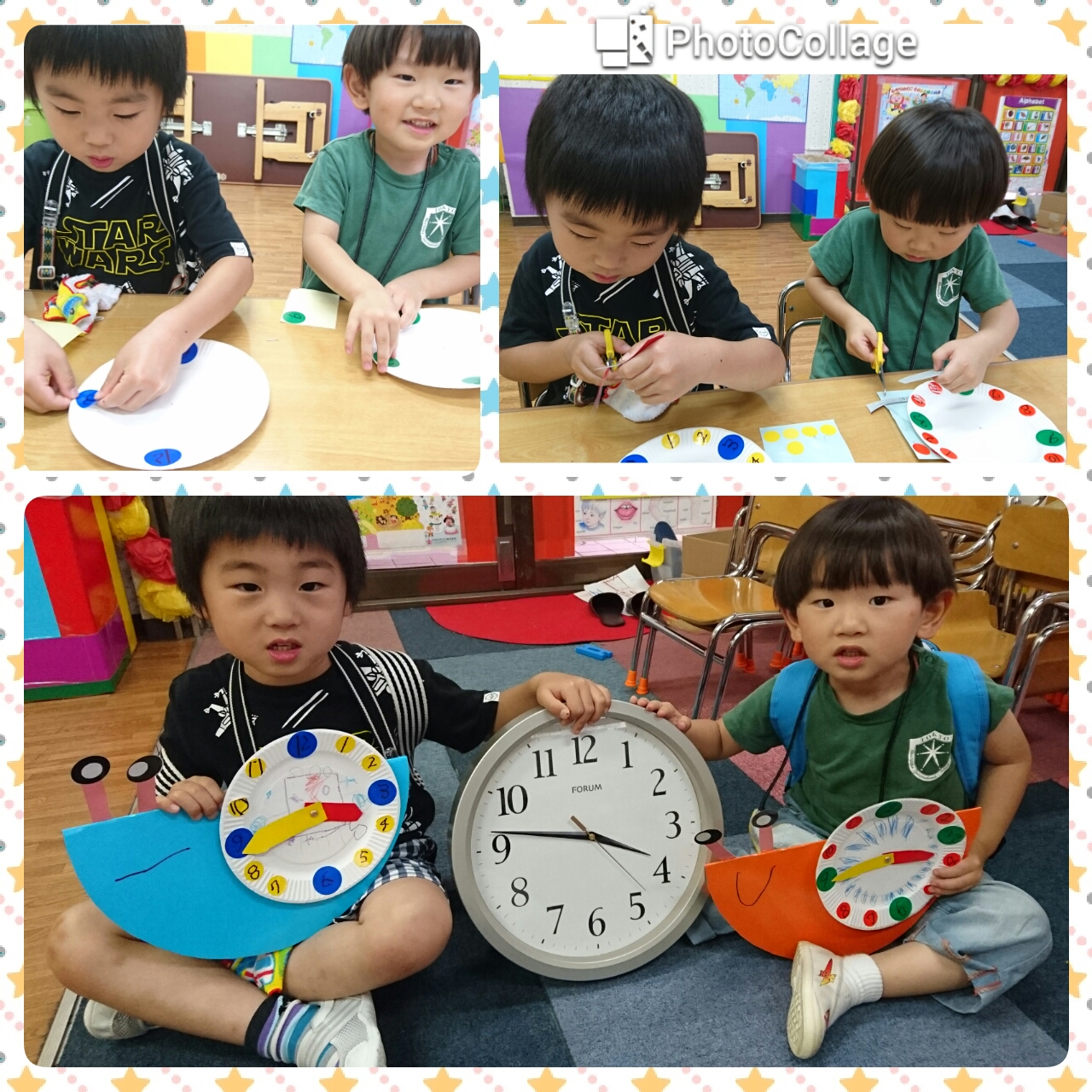 年少さんは、時の記念日にちなんでカタツムリの置き時計を作りました。文字盤を見ながら、数字のシールを貼ったり、針を動かしたり、時計の歌も歌いました♪