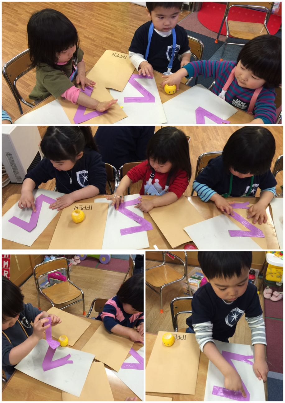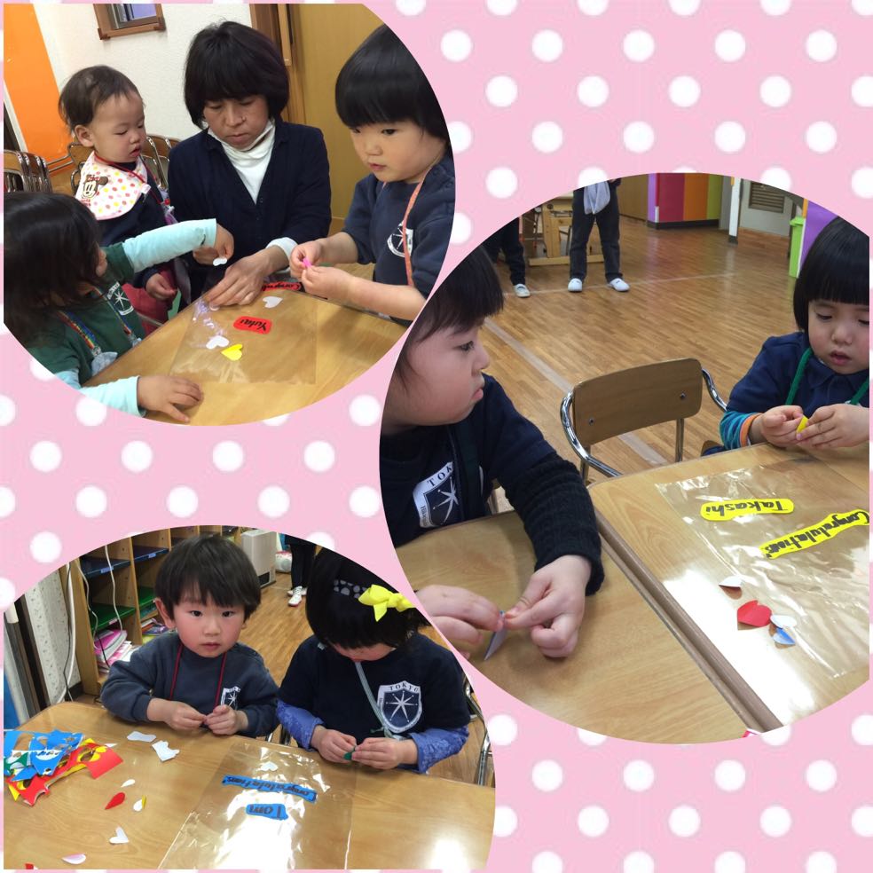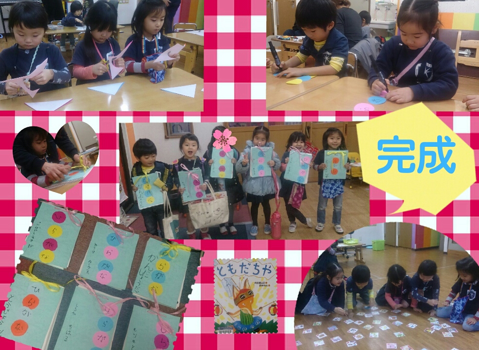 お友だちの名前、自分の名前の平仮名が書かれた紙をバラバラに置き、誰が一番早く名前を完成させられるか競争しました!!