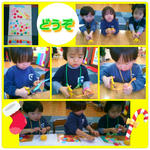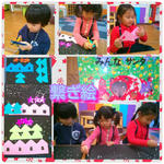 モンテッソーリの日常と同じ教具を用意し、魅力的な活動を行いました。そのあとは、切った紙を画用紙に貼り表現遊びを楽しみました。