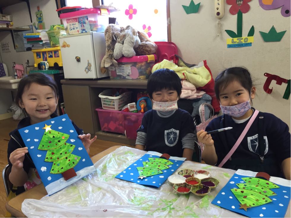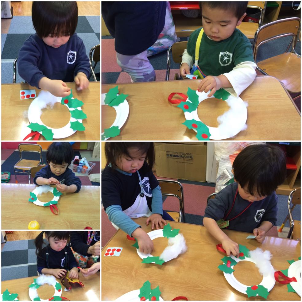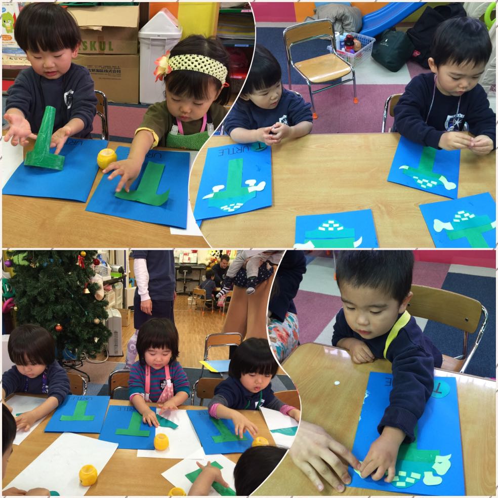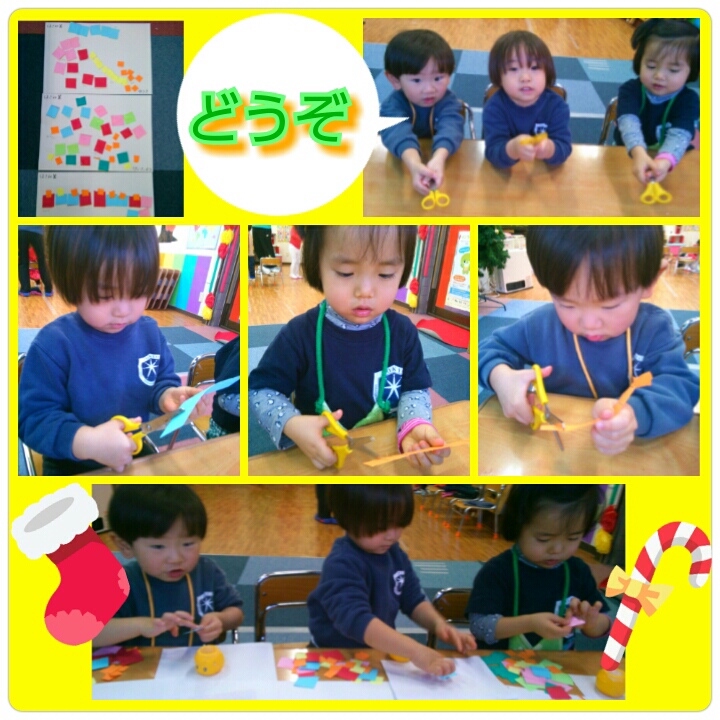 はさみが上手になったので、繋ぎ絵でクリスマスの作品を作りました。