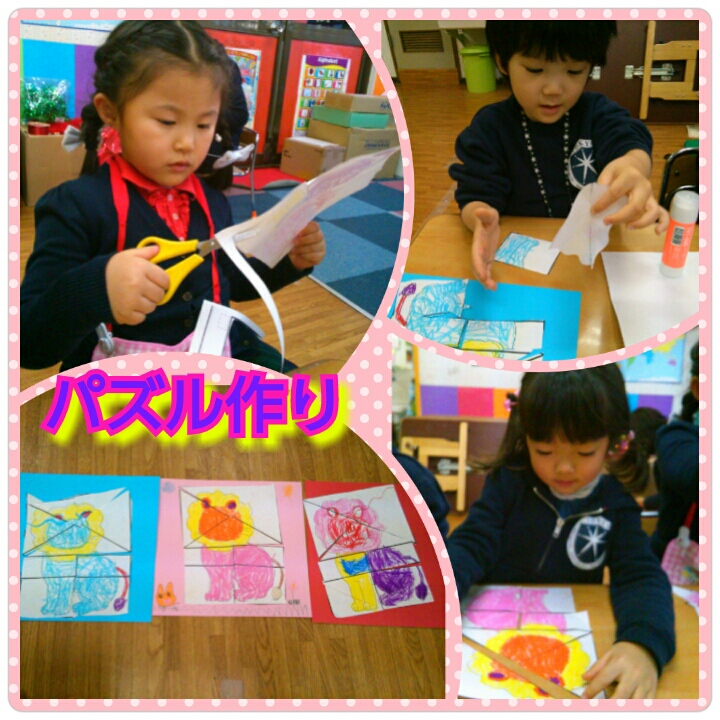 パズルブームのアップルさんは、ハサミを使い自分でパズルを作りました。
