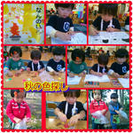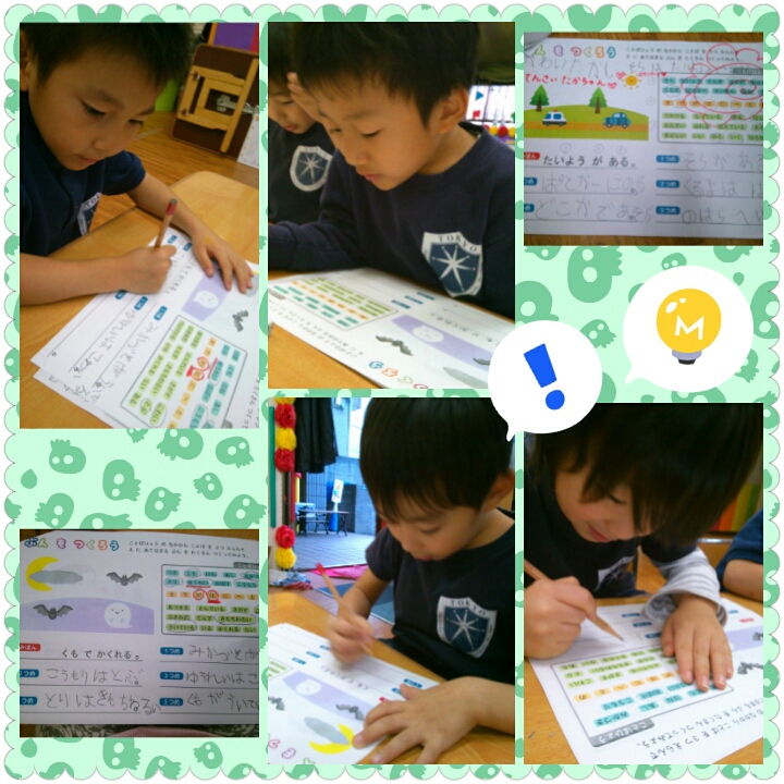 文章を作る……今日は、決められた主語、述語などを使い絵にあった文章を作りました。決められた単語を使うと、難しく感じてしまうようですが、頑張りました♪