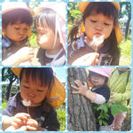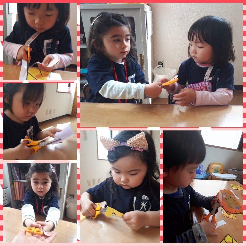 はさみの受け渡し『どうぞ』『ありがとう』と、小さな可愛い手を使ってはさみリレーをしました。刃先に注意しながら、切る練習をしました。