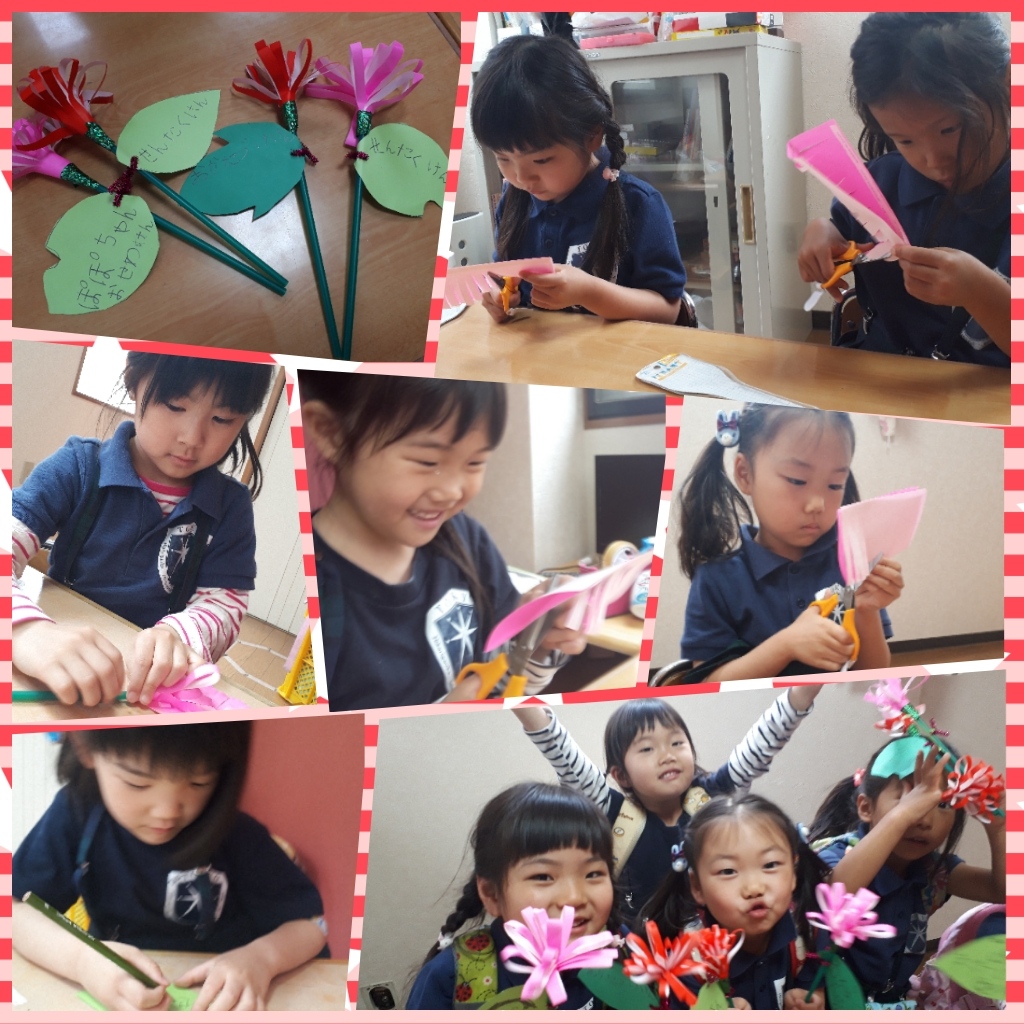 年中さんは、母の日製作。1枚だけ私がカーネーションの花びらの見本を切ったあとは、子どもたち自身で太さを気にしながら切りました。