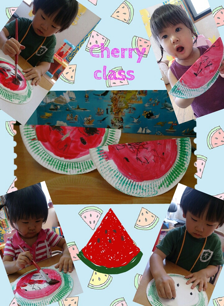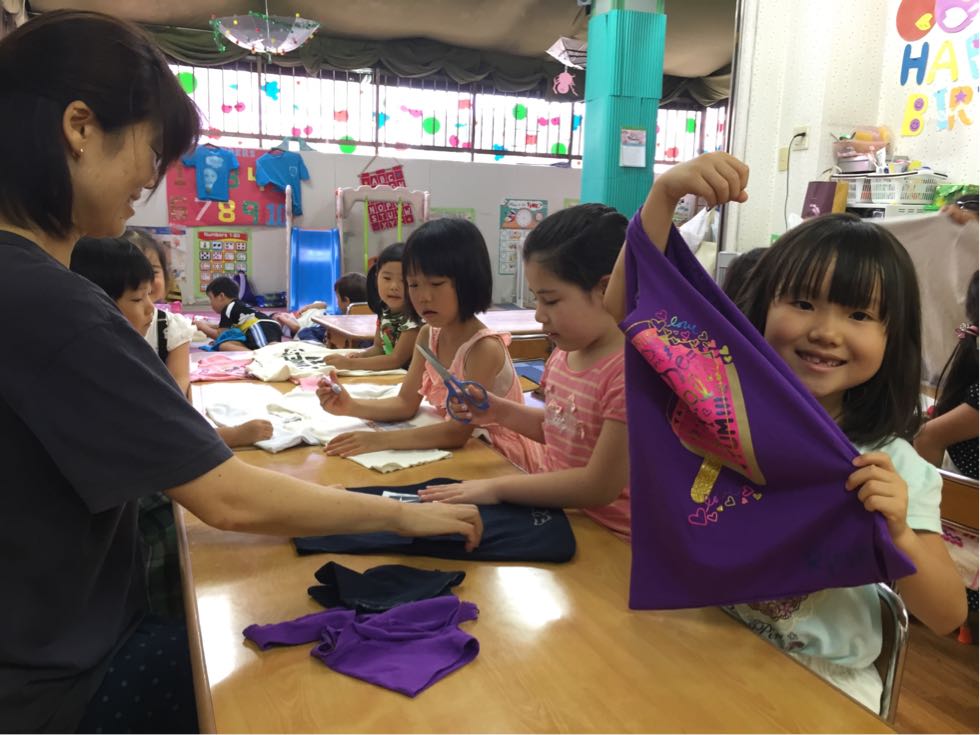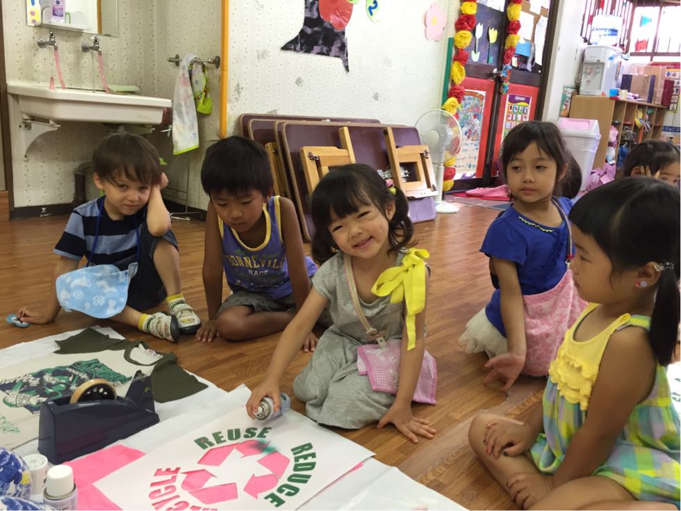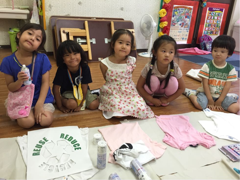 In the afternoon,we printed out T-shirt. We used our old T-shirts and made it decorated with spray-paints.