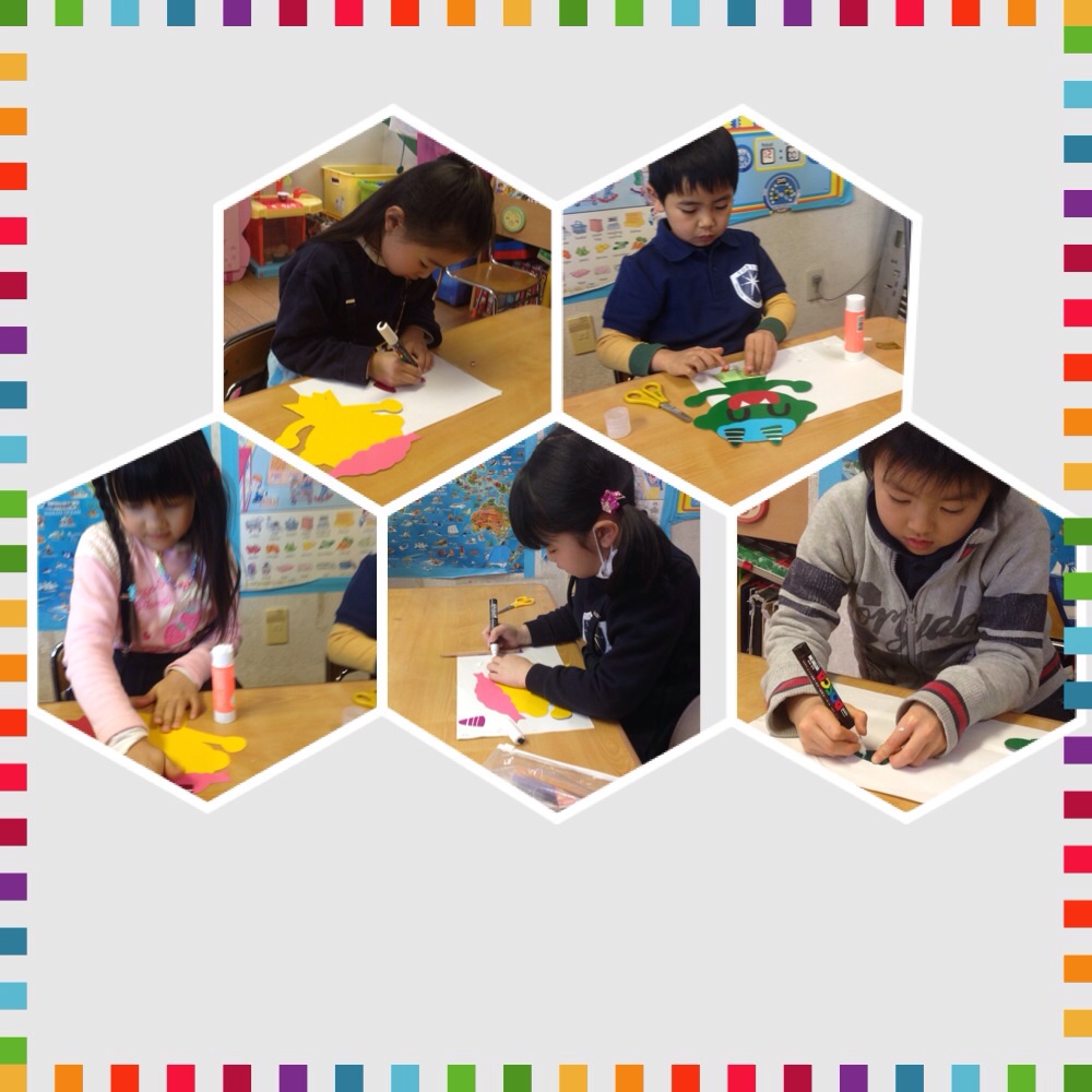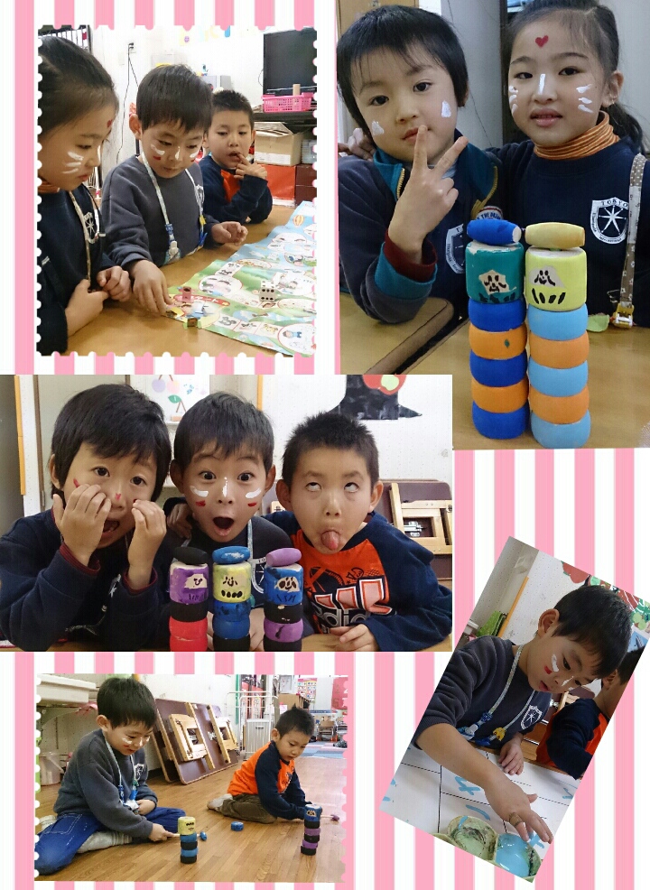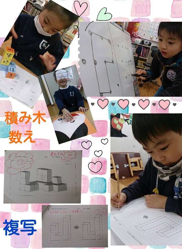 難しいプリント……複写と積み木数えの問題を『楽しい♪』と言いながら取り組んだ3人。最後は、福笑いをして大笑いをしながら帰りました~