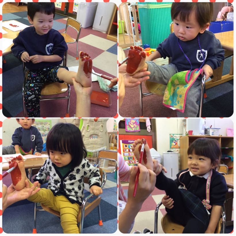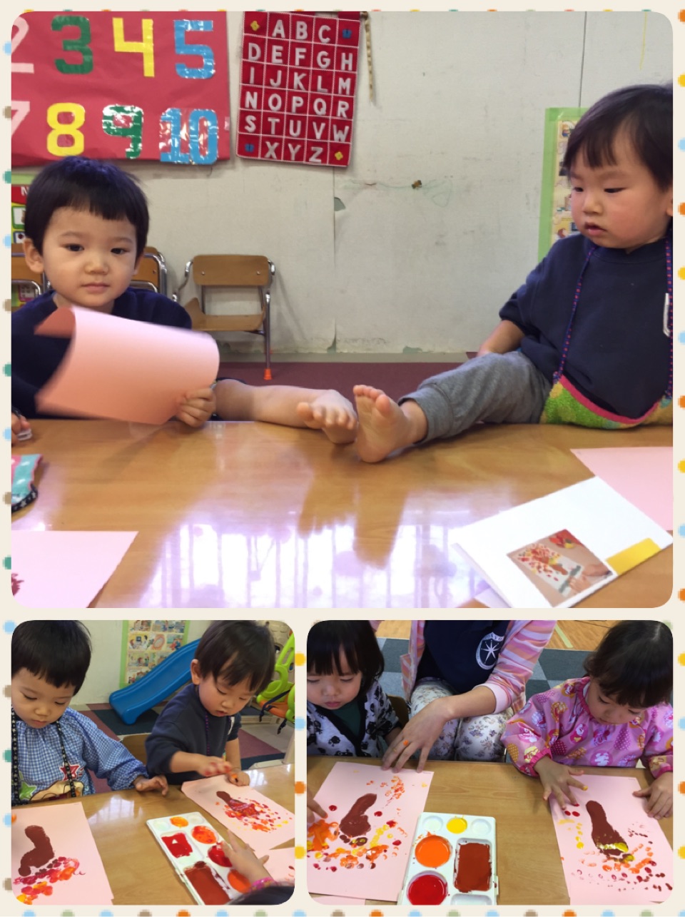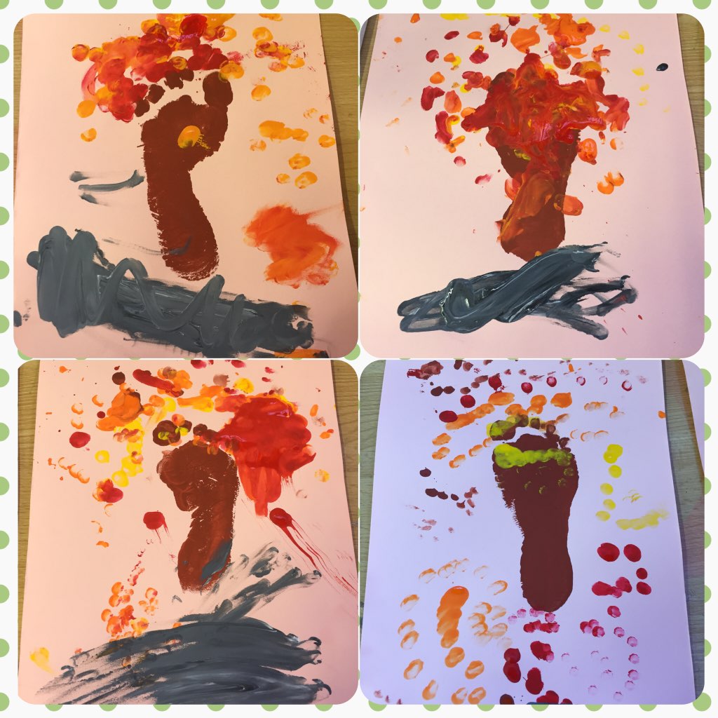 It's finally autumn! The leaves on the trees are turning yellow and soon will all fall down on the ground. And so,we started this week by making tree with yellow, red and orange leaves....using our foot as the tree trunk and our fingertips for the leaves...