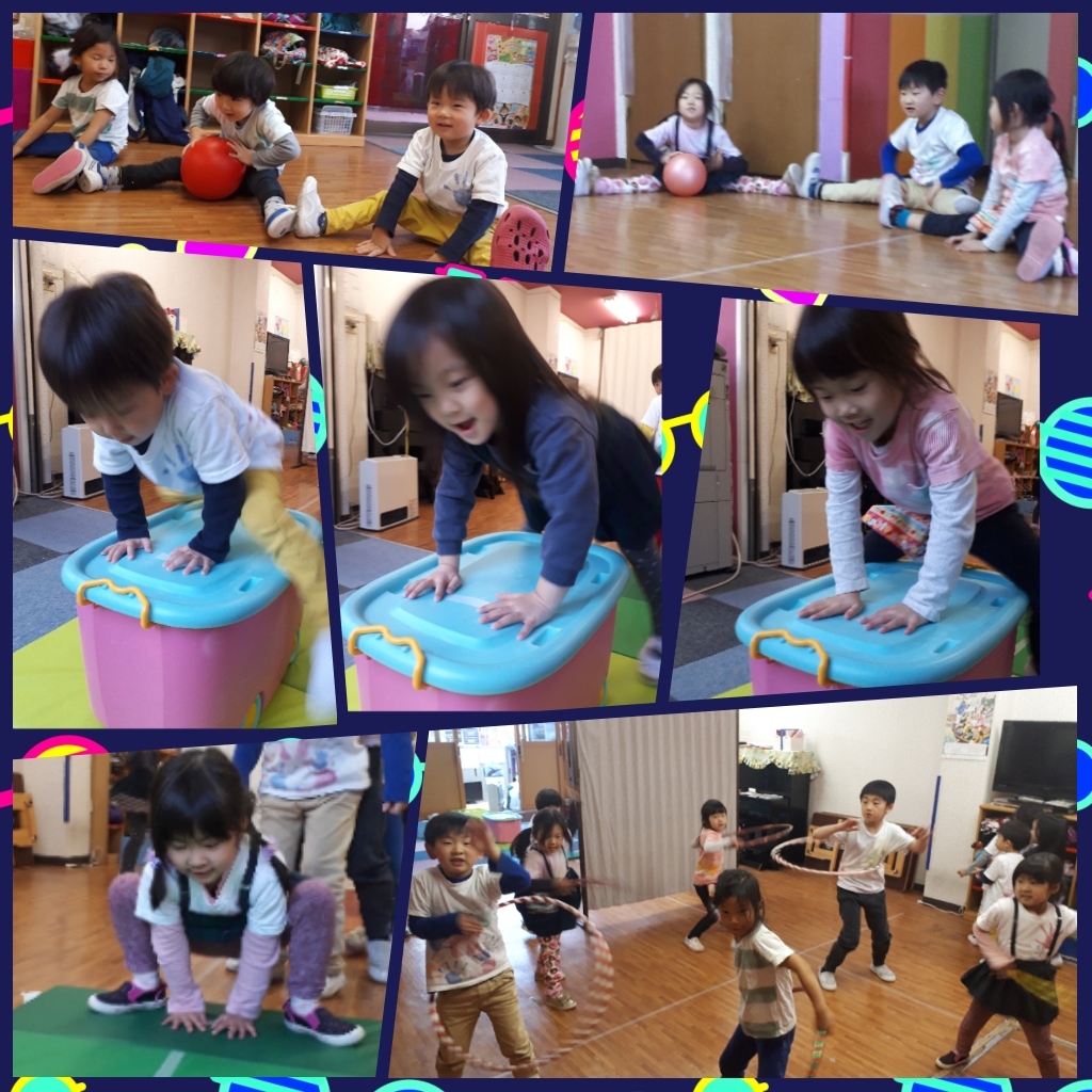 跳び箱の準備段階で、足を開いてjump jump♪バランスをとるのが難しかったけど、上手に跳べたね!