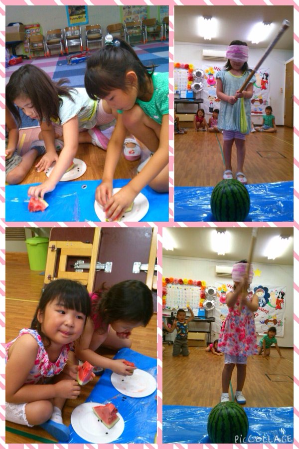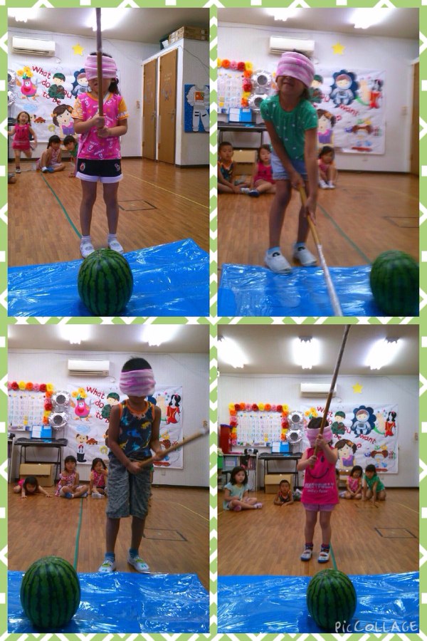 SUMMER SCHOOL 2回目が本日終了しました。 最終日の今日はスイカ割りをしました〜‼︎ 目隠しをしてから5〜10回廻り、お友達のアドバイス通りに進むのですが、これが難しい。全員に1回づつトライしてもらいましたが、かするくらいで割れる様子なし…。やりたい子には何度もトライしてもらいましたがダメ…。最後は先生の出番!子供達にアドバイスしてもらい、やっと割る事が出来ました。