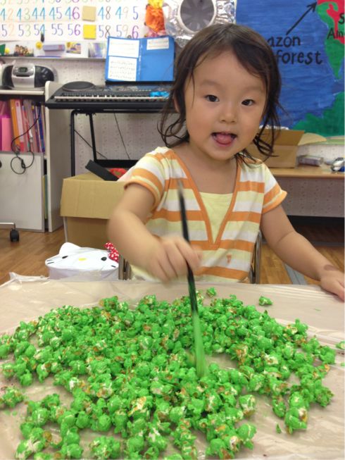 In the afternoon we painted popcorns and toilet paper rolls. We made forest. It was fun.