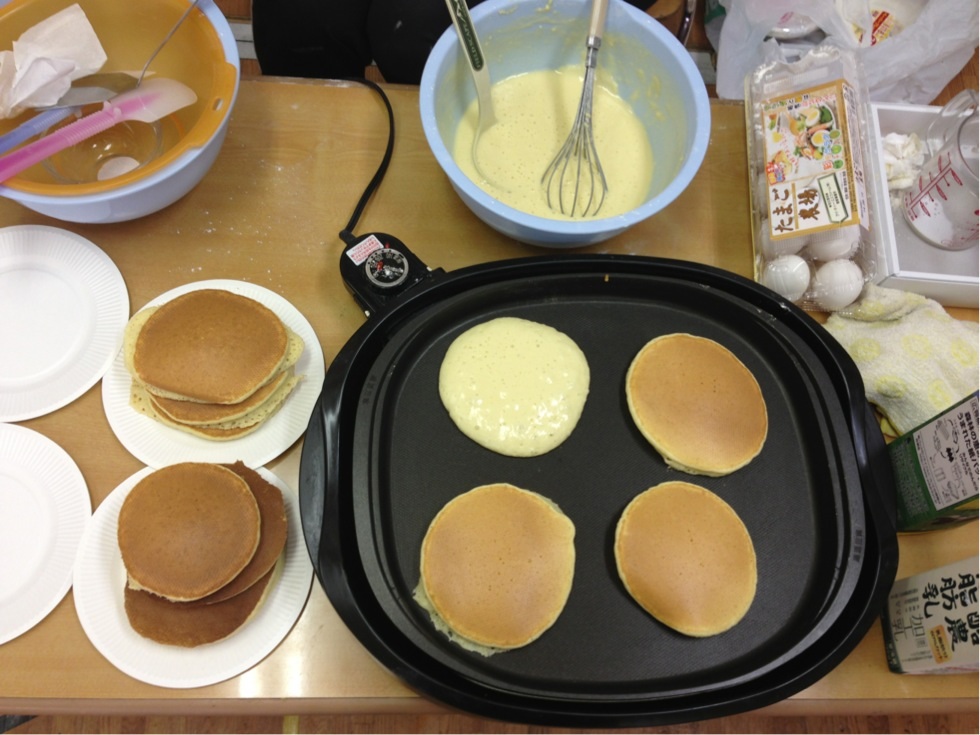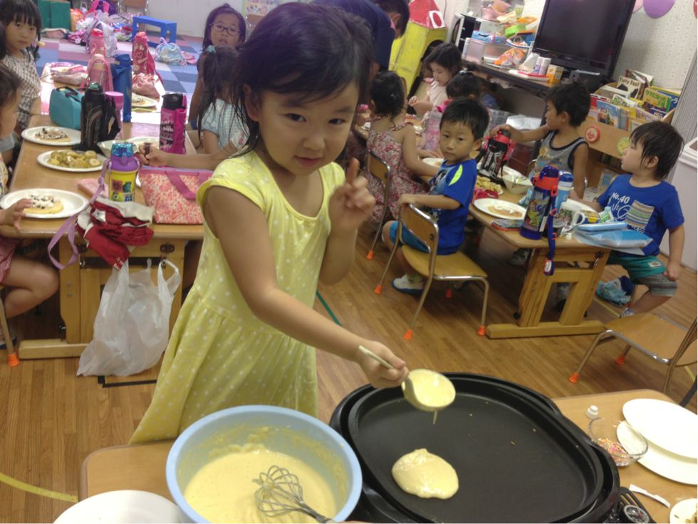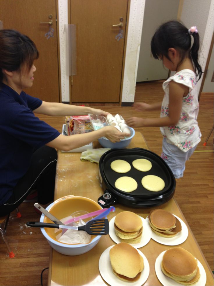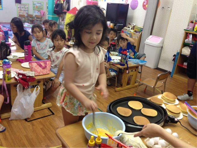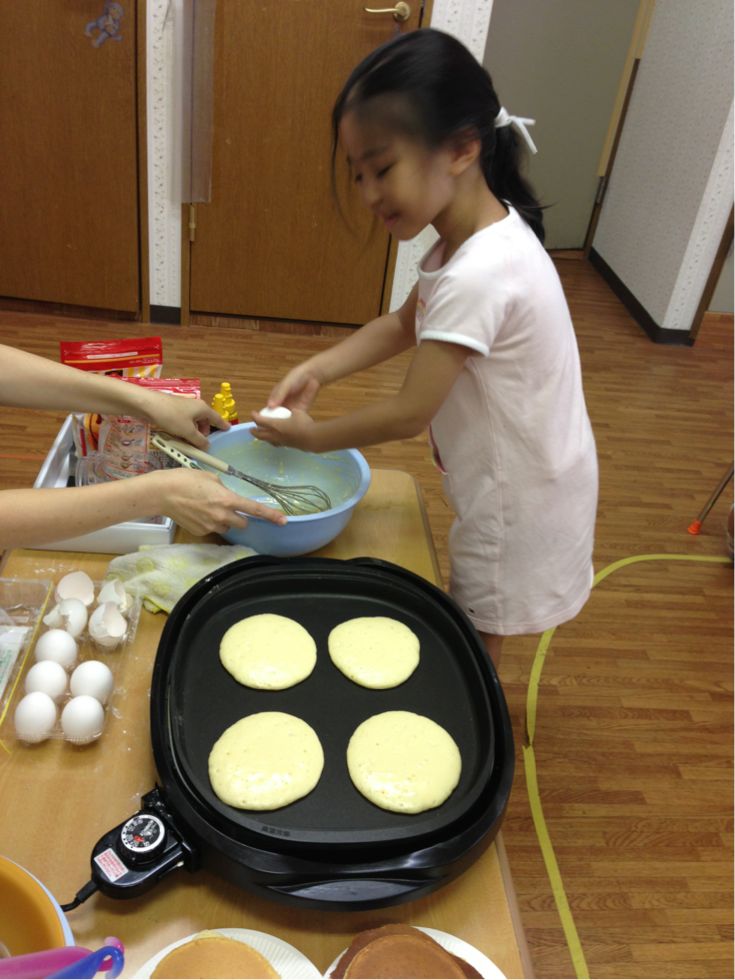 We made pancakes.Kids broke the eggs and mixed it with milk and flour. It was fun to cook together.