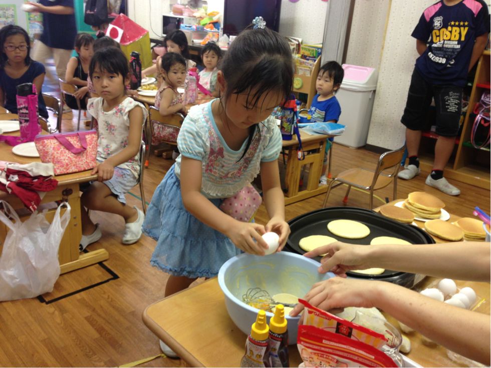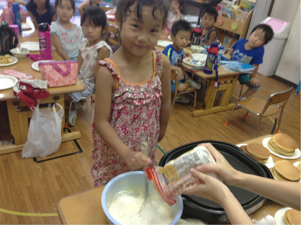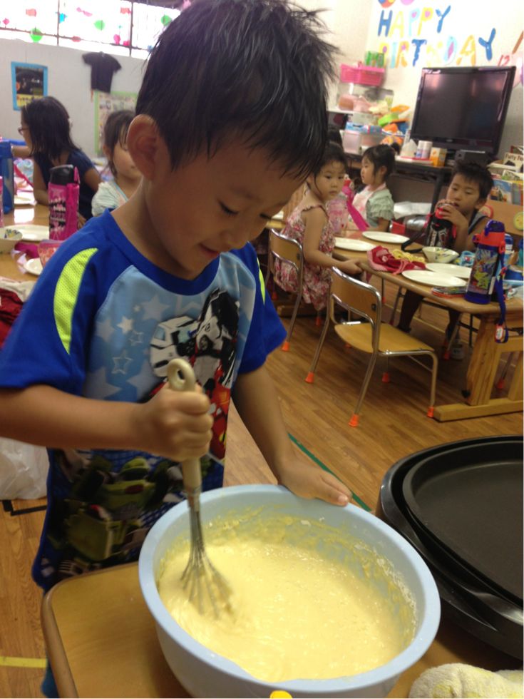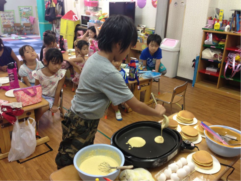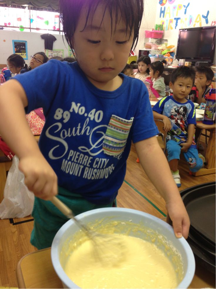 We made pancakes.Kids broke the eggs and mixed it with milk and flour. It was fun to cook together.
