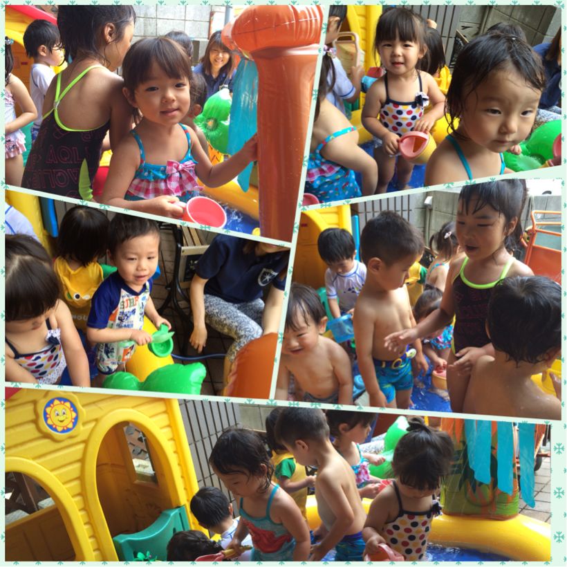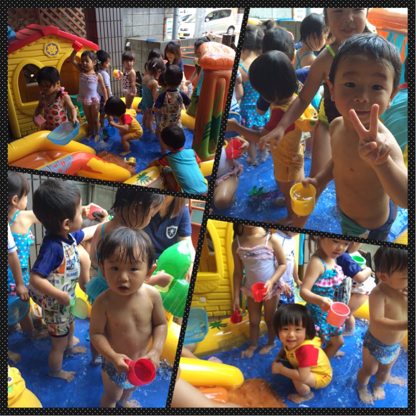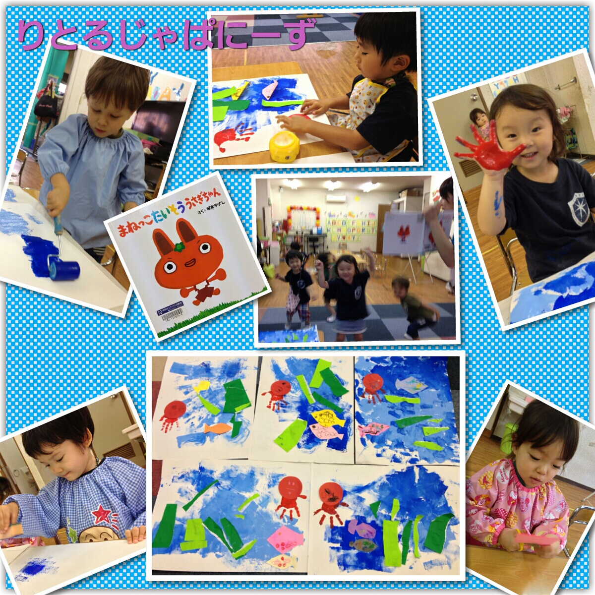 この日は、海の中をテーマにスポンジ、ローラー、筆などいろいろな道具を使って画用紙に色を塗ってハサミを使って魚、折り紙をちぎって海藻、手型でタコを作り、素敵な製作が出来ました