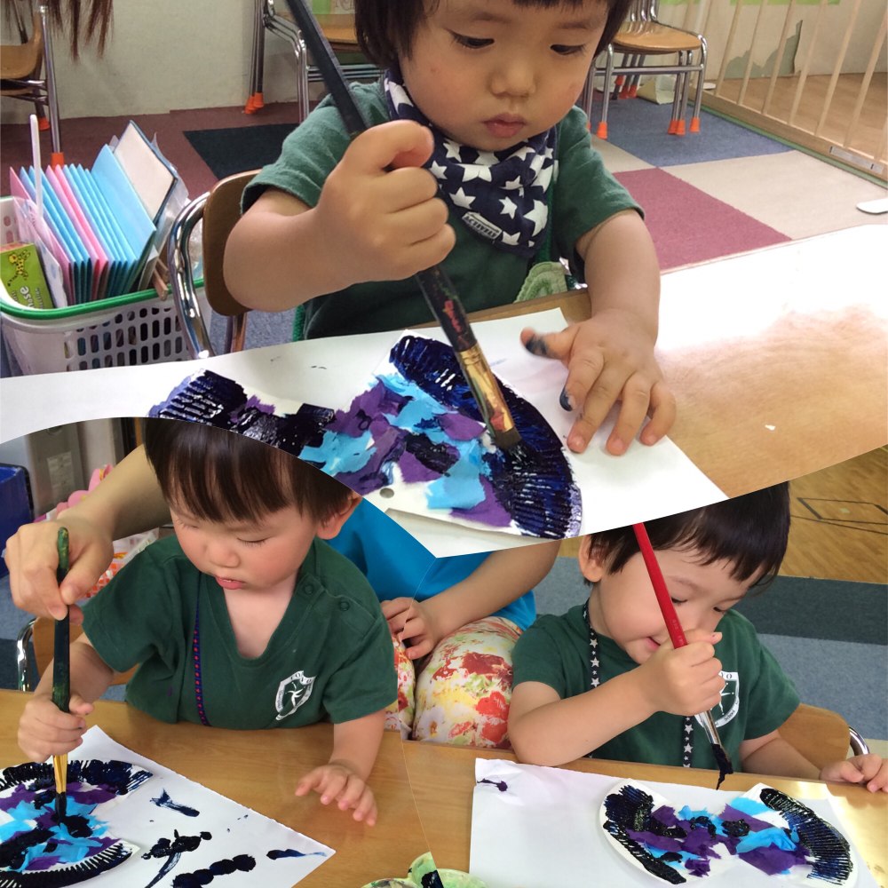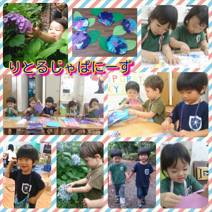 みんなで紫陽花探しに行った後、お花紙を裂いて綺麗な紫陽花を作りました