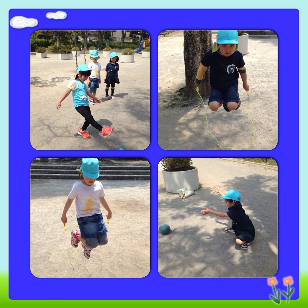 At the park, we tried to be physically fit. The children practiced to kick, throw balls and do jump roping..
