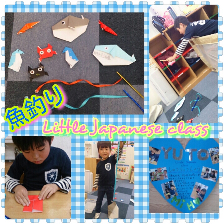 釣り竿を作った後は、折り紙でエビ、かに、くじら、(釣れないけれど…)ペンギンを作りました