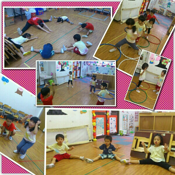 でも、柔らかくなったかな フラフープや創作ダンス、ケンパをして、フラフープを使ってドーンじゃんけんポン!!!ルールを守って楽しく体を動かしました