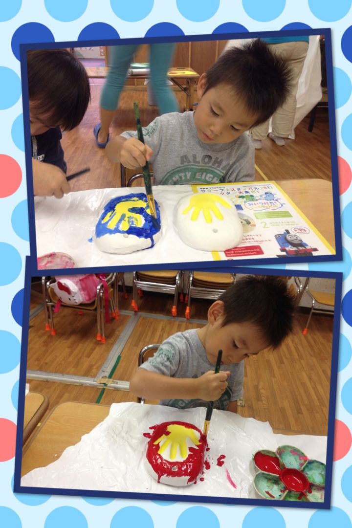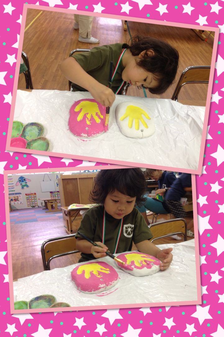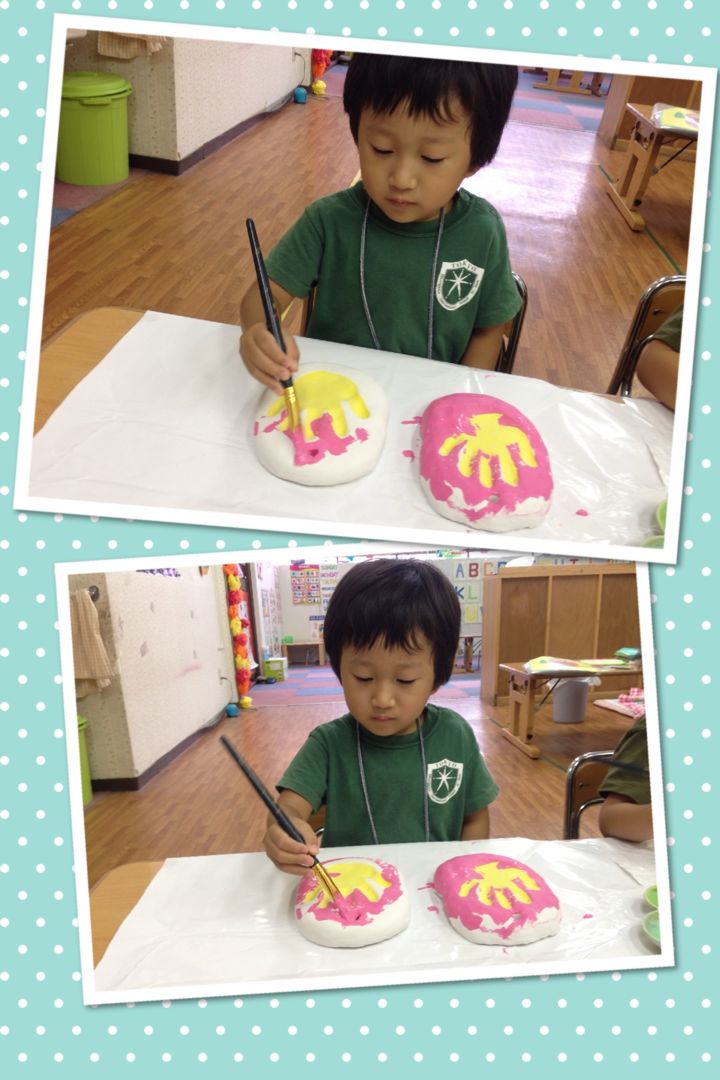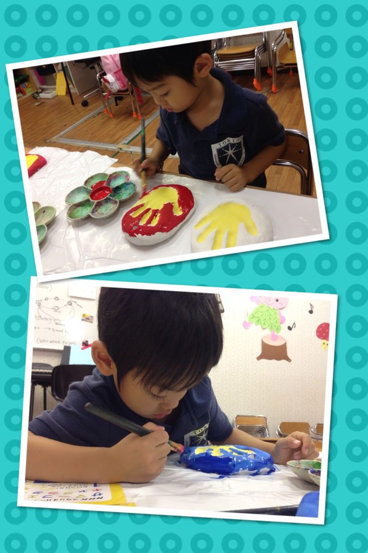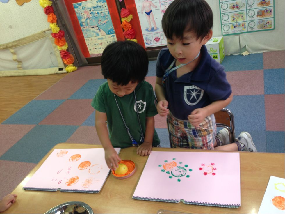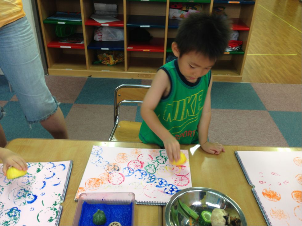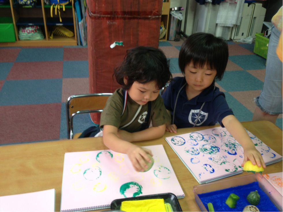 We also did vegetable stamps, using different kinds of vegetables like okra, lemon, lotus, green bell pepper, and bitter gourd (goya) and dipped them into different colored paints...they enjoyed being artistic...