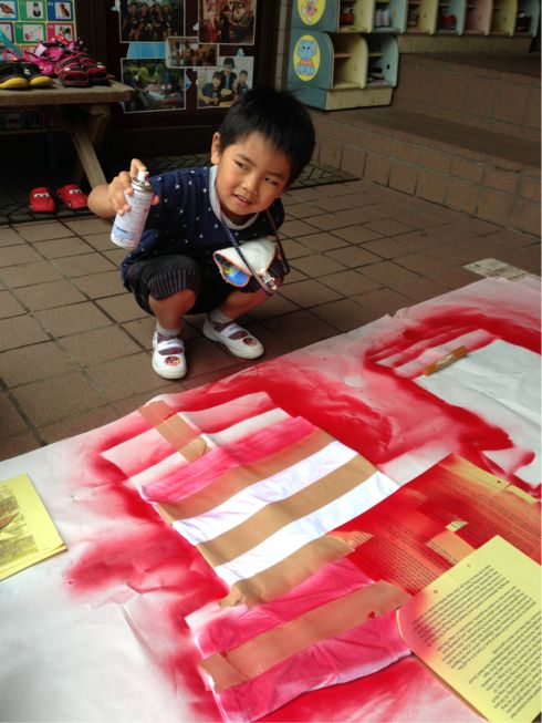 In the afternoon,we printed T-Shirt. We used red and blue paint to make the flag of the USA.