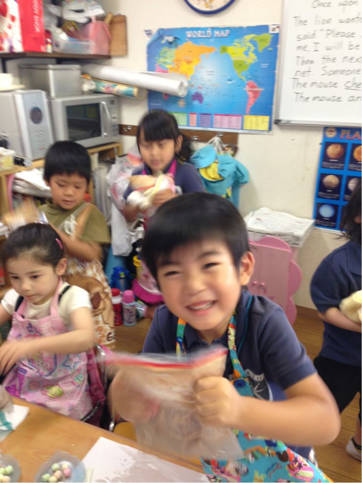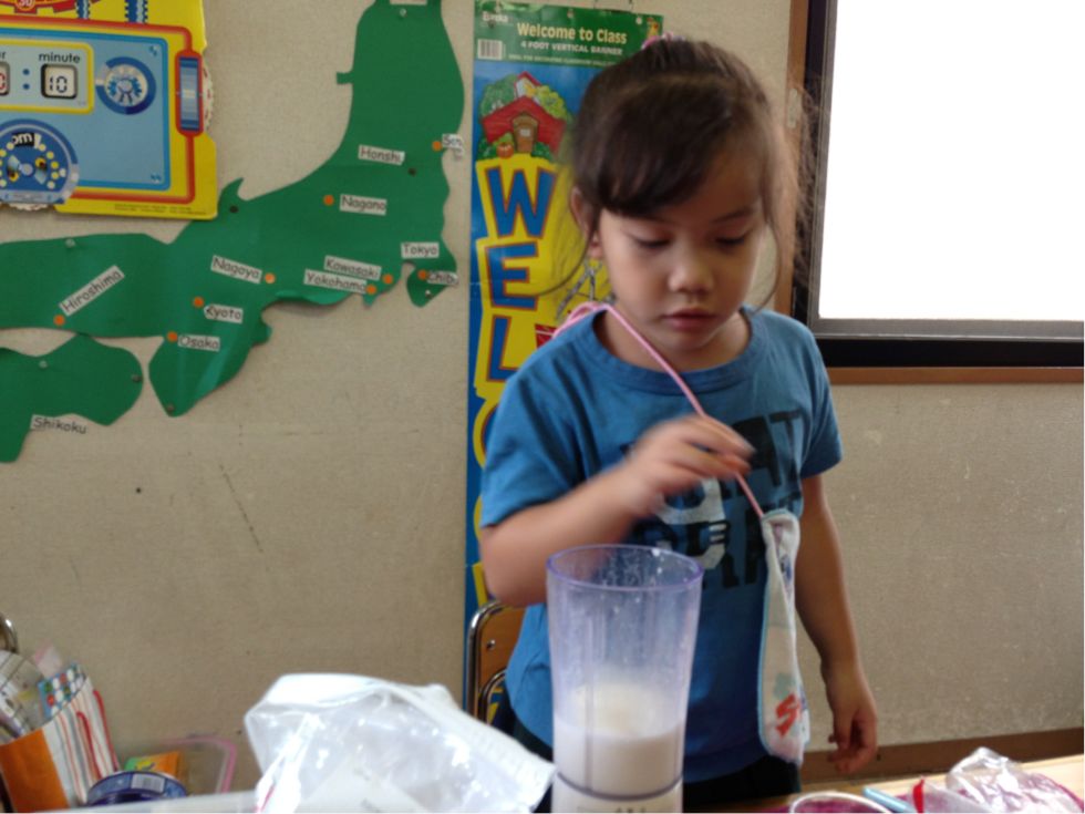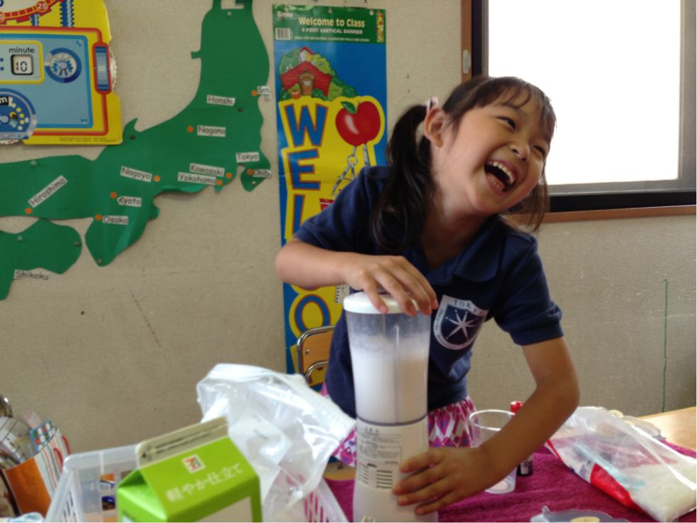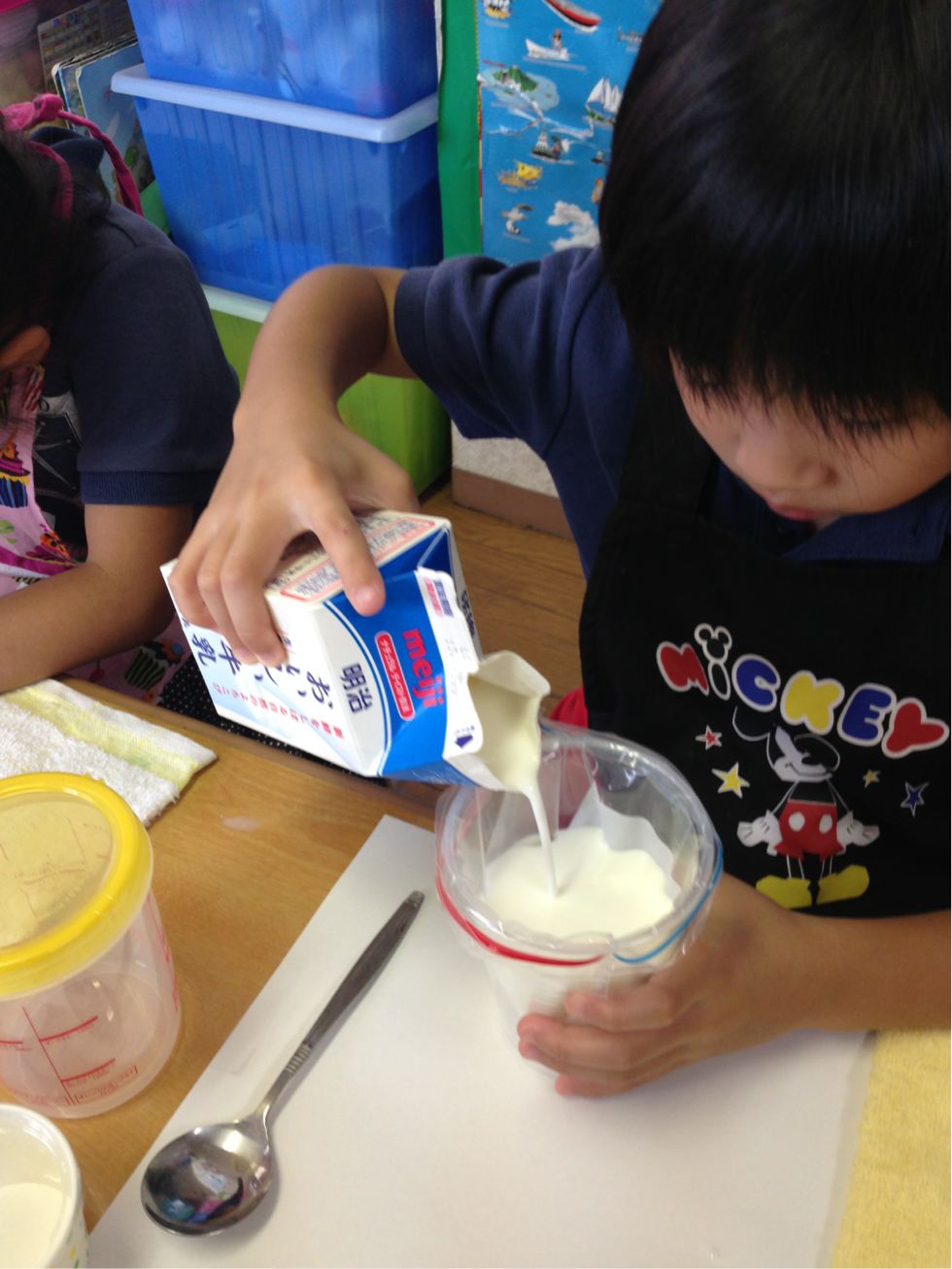 And marshmallows. Then the children shook the plastic zIplock bag with milk and other ingredients. , They were all looked excited.
