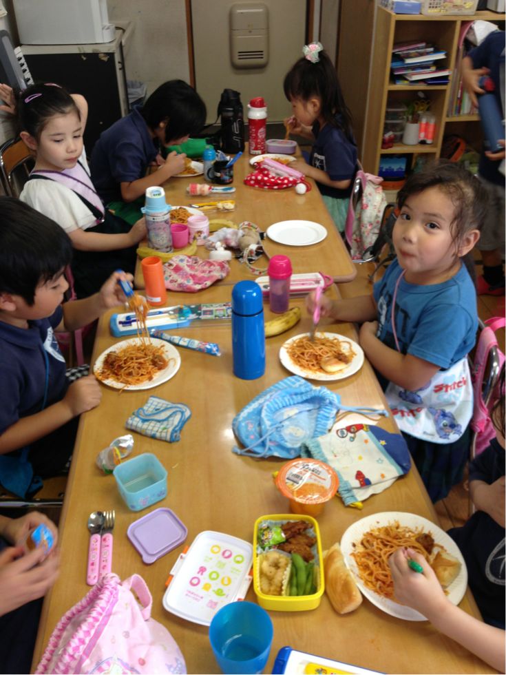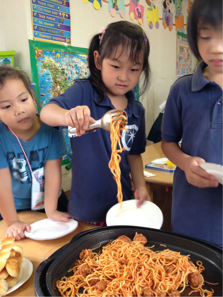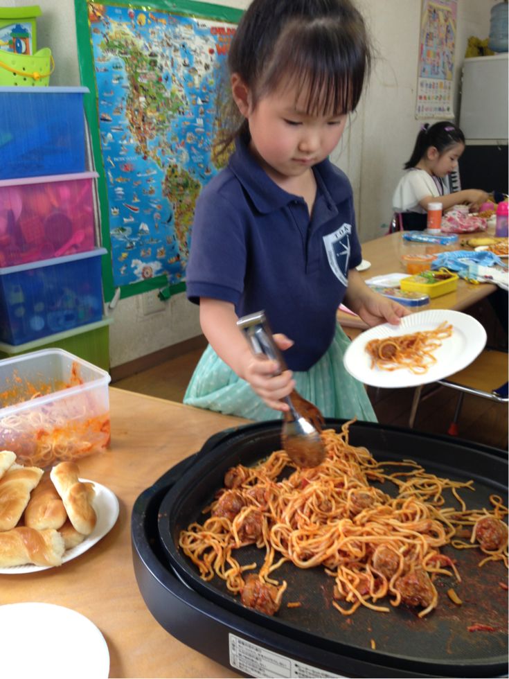 At lunch time we had spaghetti with meatballs and bread rolls.