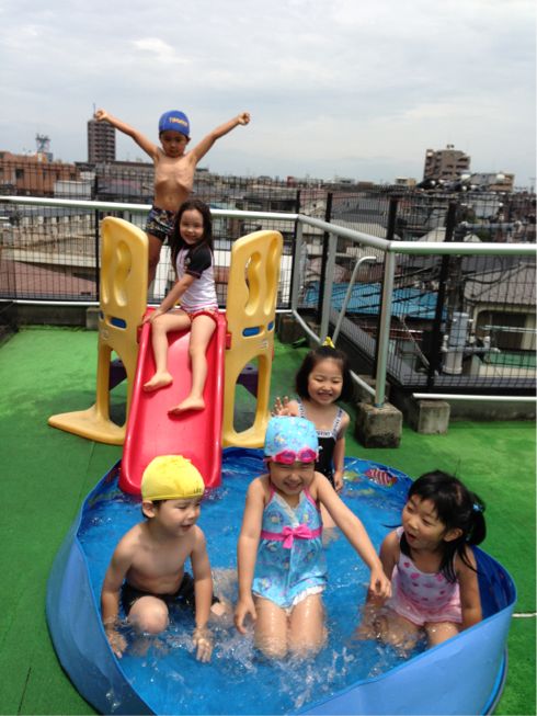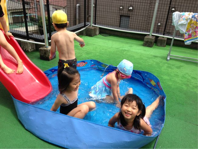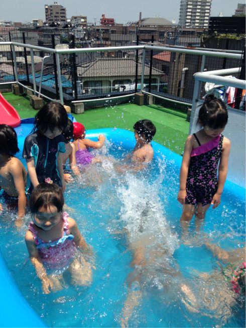 Since the weather was really hot and humid these few days kids played in small pool and they also tried big pool on the rooftop. Some of them were brave enough to sprinkle the water on their older friends from Apple class…All kids really had good time and lots of fun!