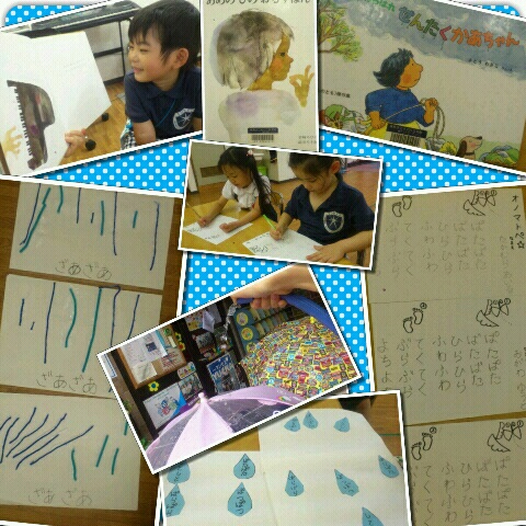 擬音語、擬態語オノマトペの勉強をしました。傘に水をかけて、どんな音がするかな??