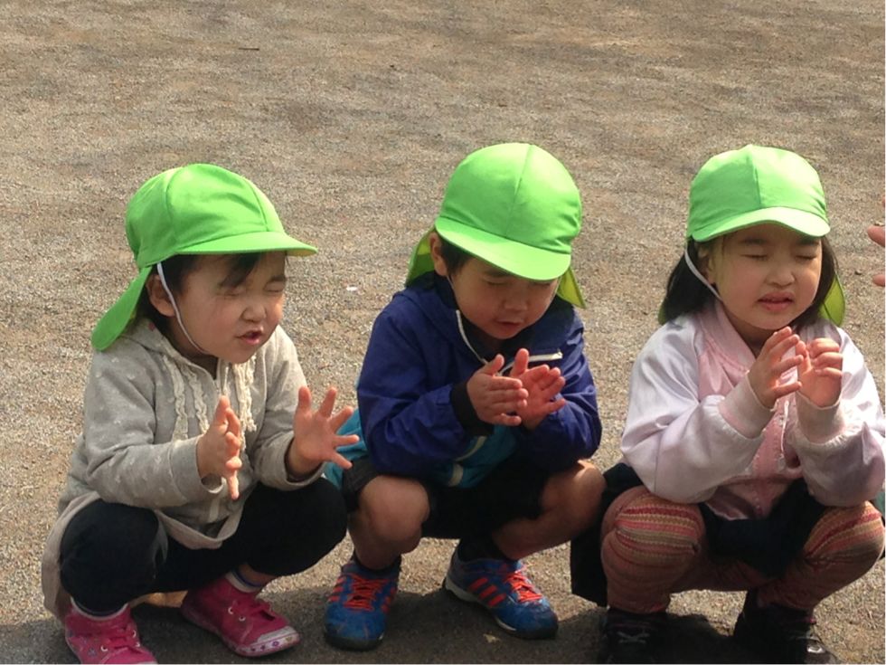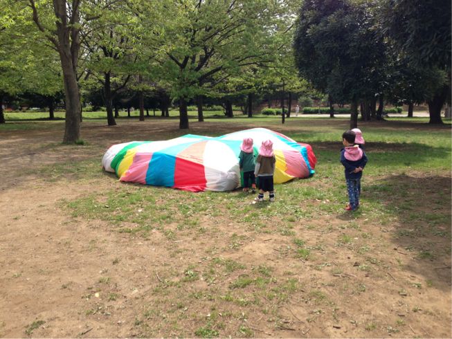 This week, the weather had been great. Melon and Grape class were able to practice the paraballoon for the upcoming Sports Day in May...and as they began practicing, Apple class were watching them attentively...