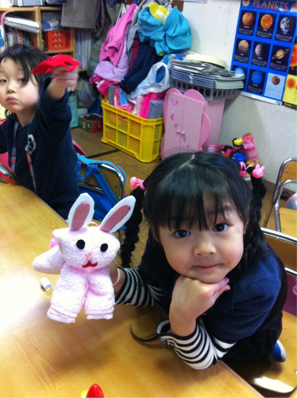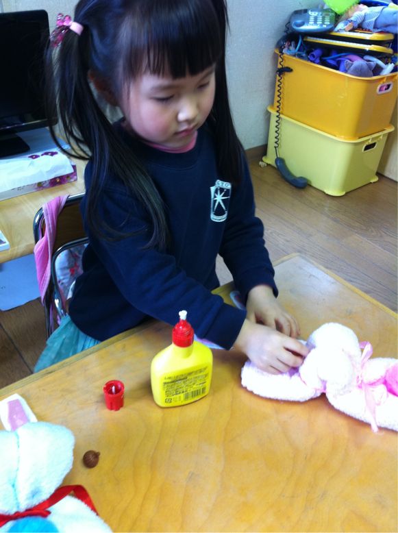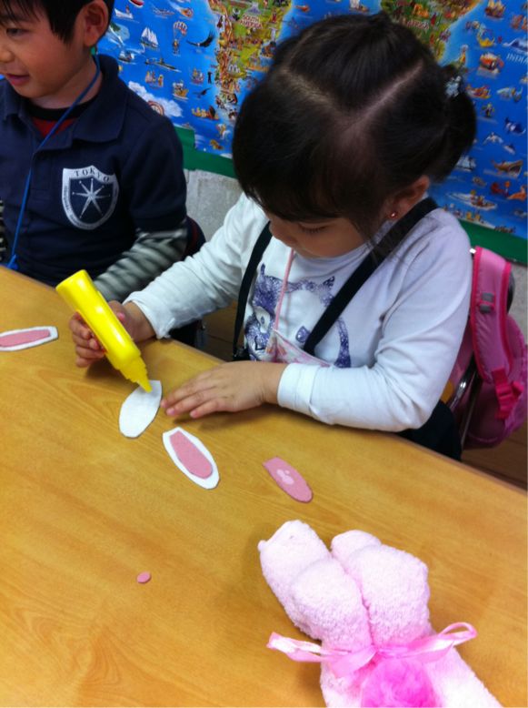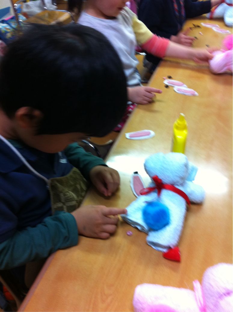 Studying is fun, but making crafts were more fun. We have many activities for this Easter, one of them was making bunny. We made bunnies out of hand towels.